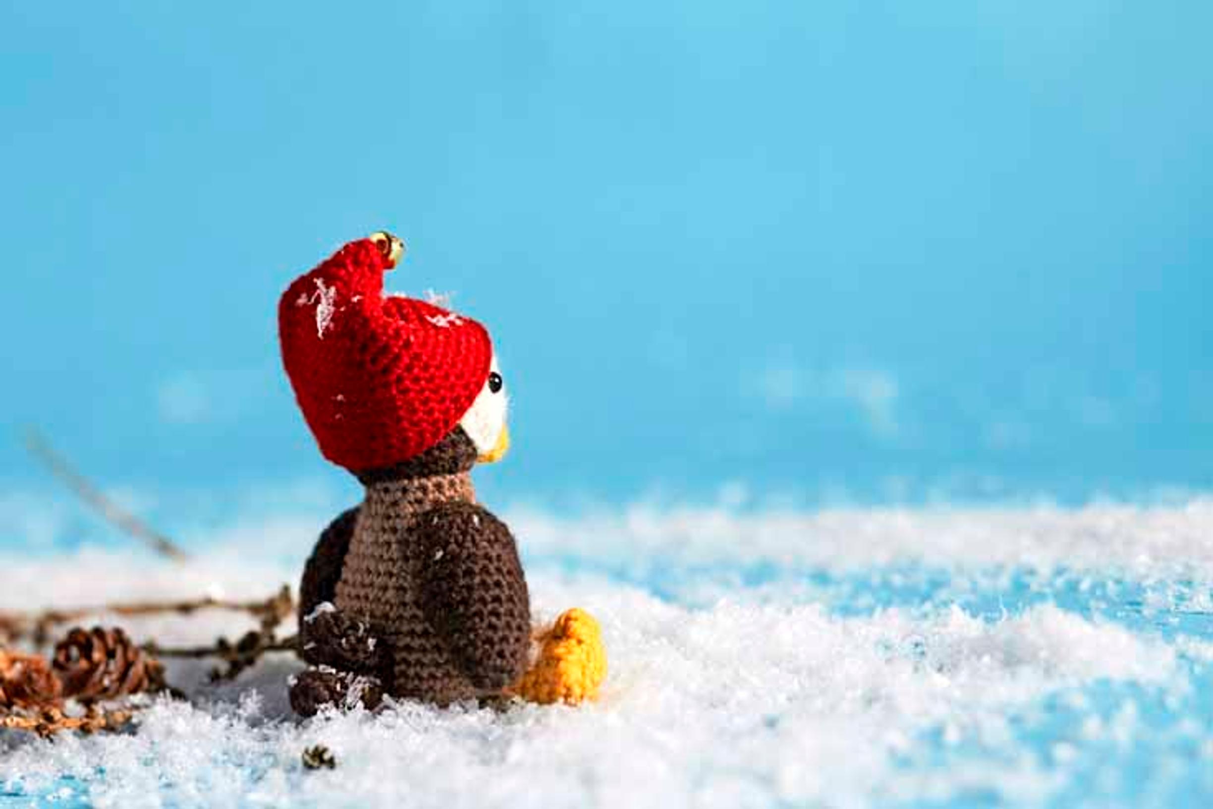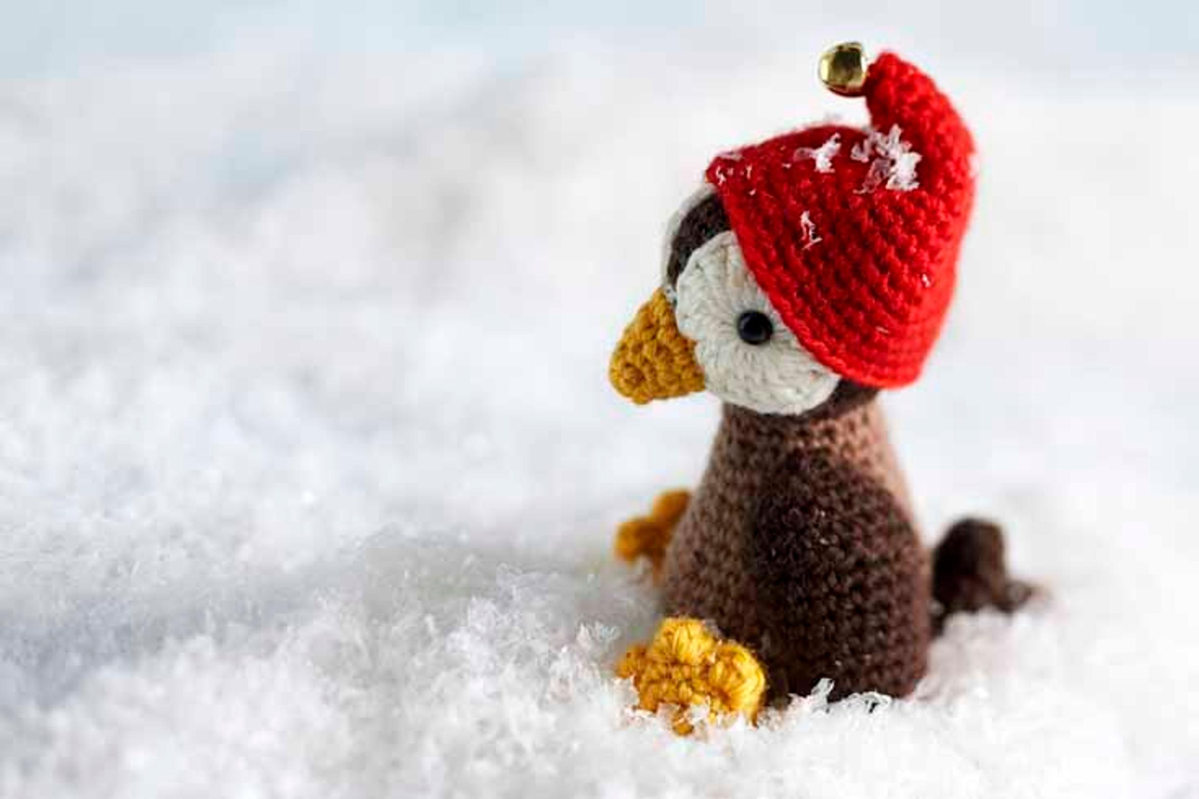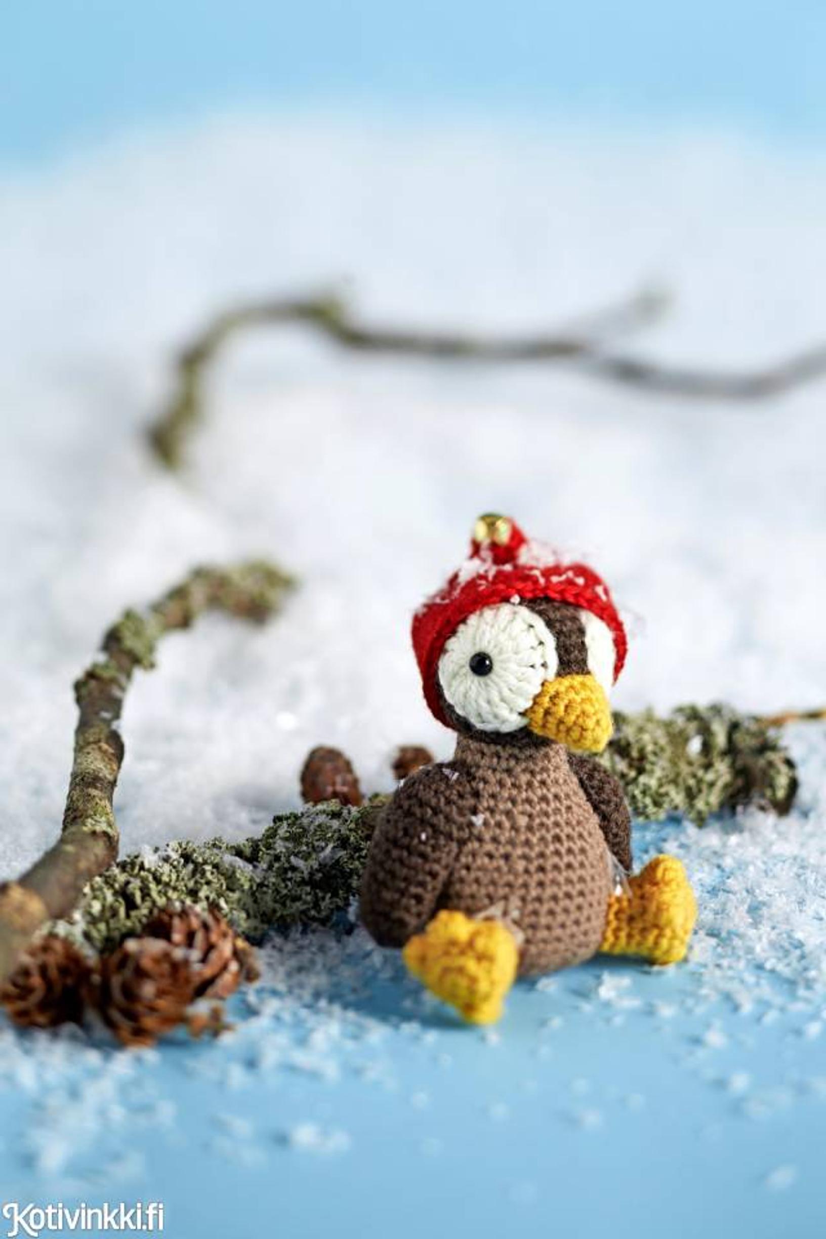 Suloinen varpunen sopii niin lastenhuoneen somisteeksi kuin lahjaksi. Jouluamigurumi virkataan kiinteillä silmukoilla.