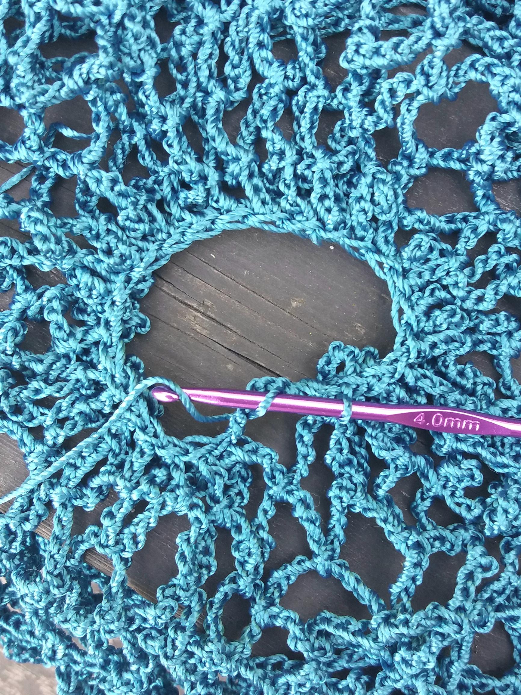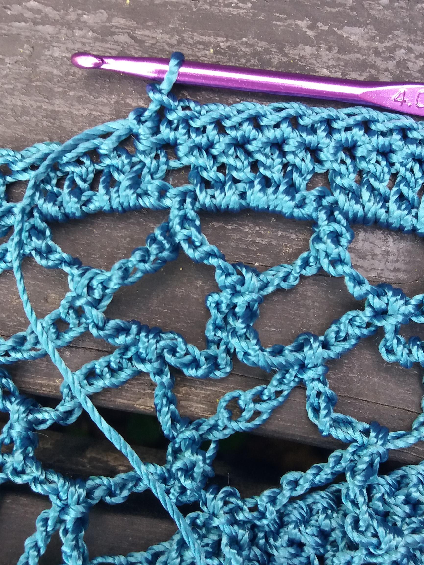 5. Tee vielä yksi kerros virkkaamalla kiinteä silmukka joka toiseen silmukkaan. Katkaise lanka ja päättele kunnolla. Langan häntä kannattaa polttaa aivan päästään, jotta se ei lähde kiertymään auki. Varo langanpäätä polttaessa osumasta verkon silmukoihin, jotta ne eivät katkea tai vaurioidu.