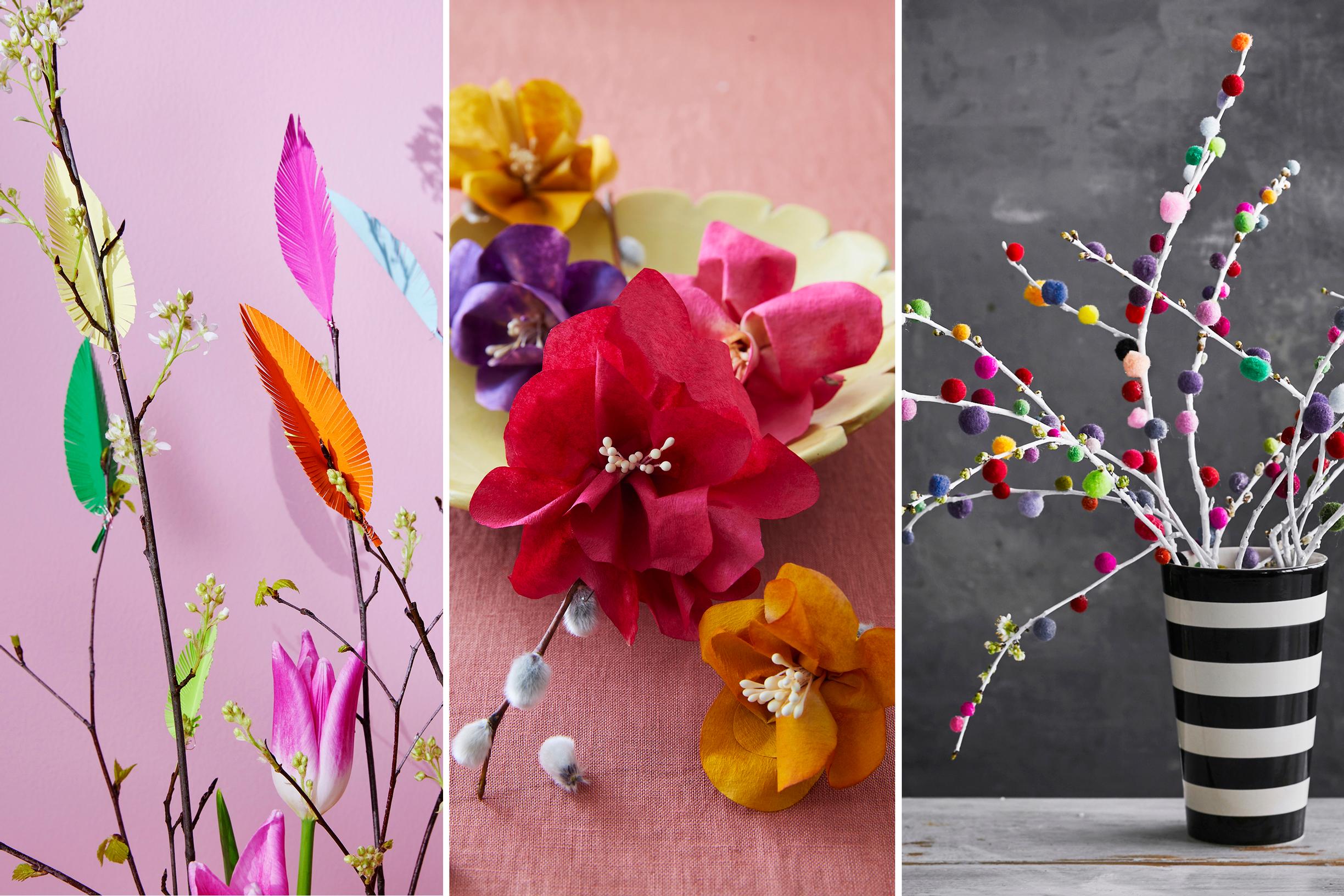 Maljakollinen värikkäitä vitsoja huokuu iloista pääsiäistunnelmaa. Nämä oksat on koristeltu valmiilla, askartelukaupoista saatavilla huopapalloilla. Jätä oksa luonnollisen väriseksi tai maalaa haluamallasi sävyllä ja liimaa pallot – siinä kaikki! Katso värikkäiden virpomisvitsojen ohje.