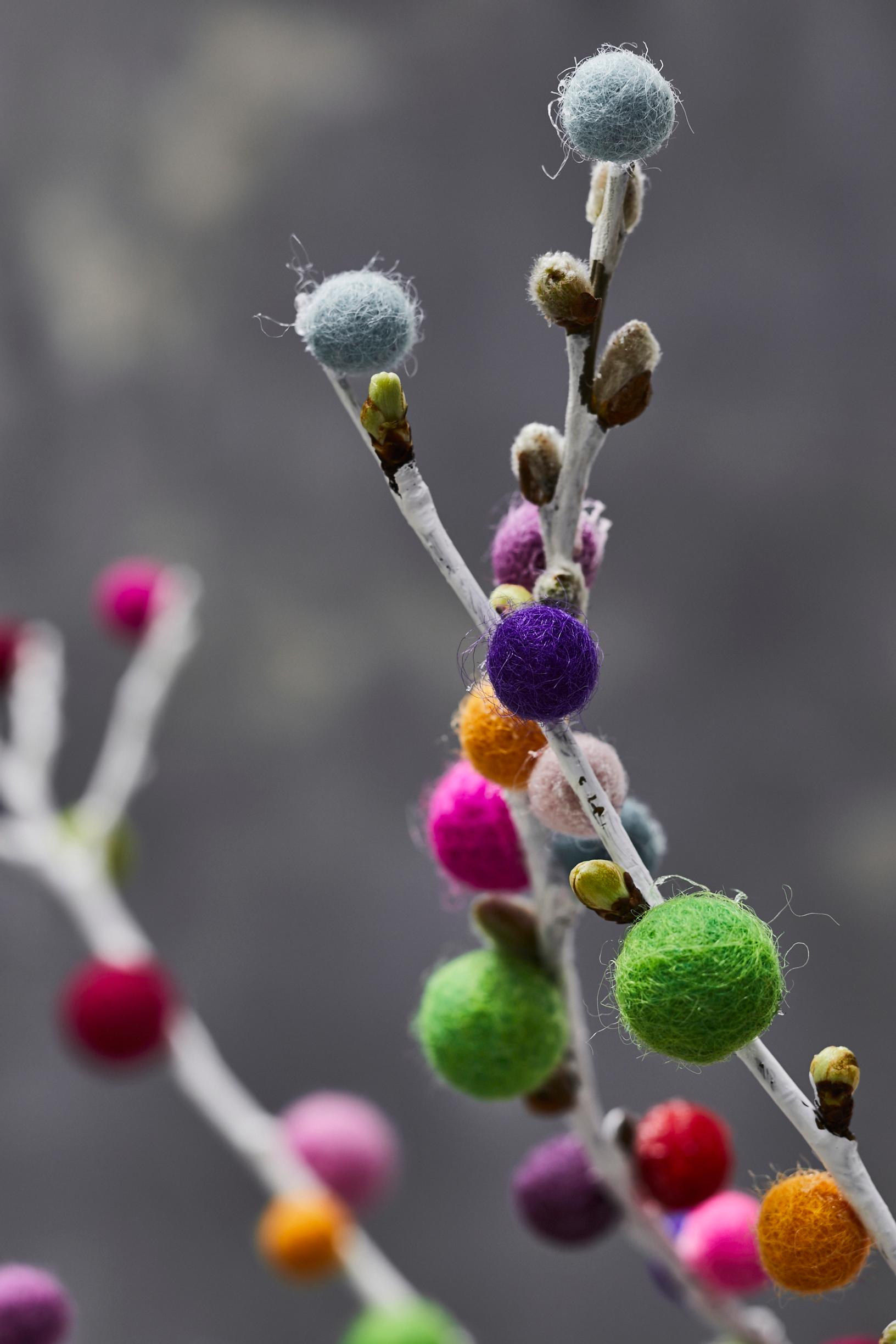 Unohda höyhenillä, silkkipapereilla ja piippurasseilla koristellut virpomisvitsat ja kokeile jotain uutta! Värikkäillä huopapalloilla koristellut oksat sopivat yhtä lailla virpomiseen ja kodin juhlakoristeluihin. Maalaa vain oksa haluamasi väriseksi ja liimaa pallot – virpomisvitsa on valmis! Maanläheisemmän lopputuloksen saat jättämällä oksat luonnollisen värisiksi ja valitsemalla hillitymmän sävyisiä huopapalloja.