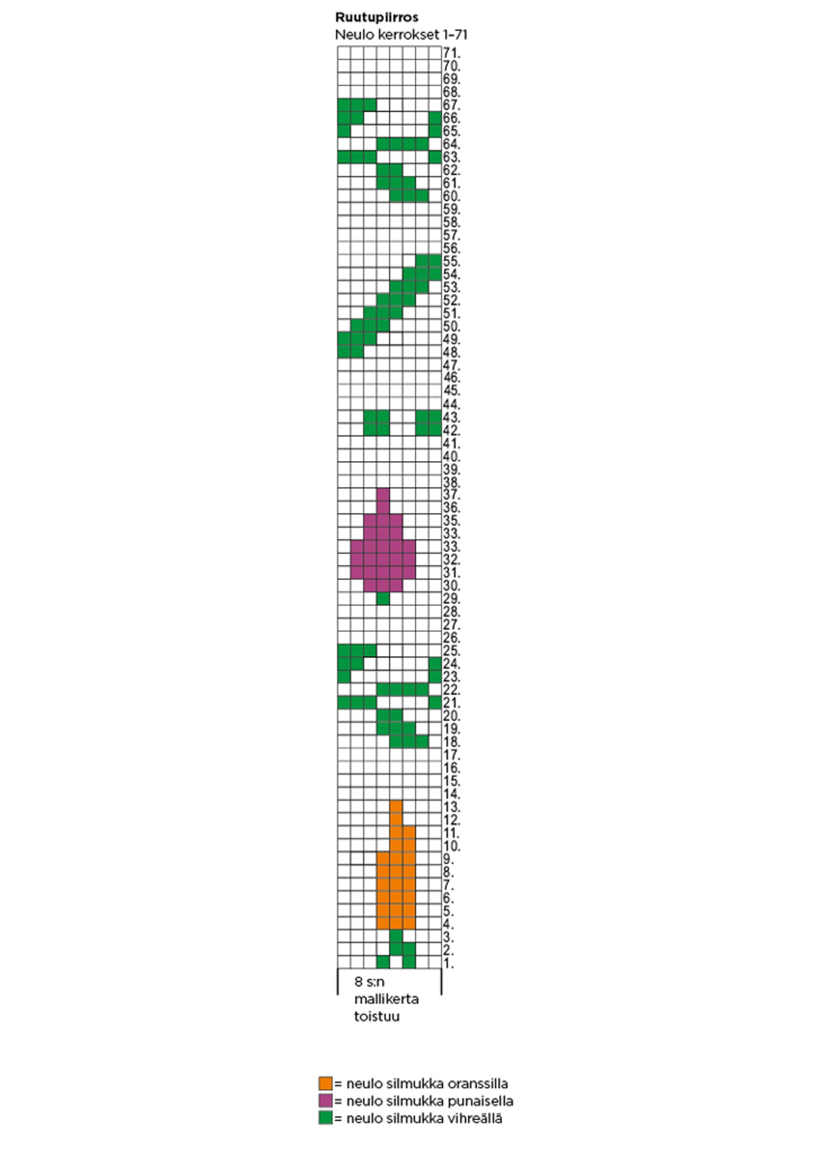 2. Aloita kirjoneule ruutupiirroksen 1. kerrokselta ja toista 8 s:n mallikerta 9 kertaa.