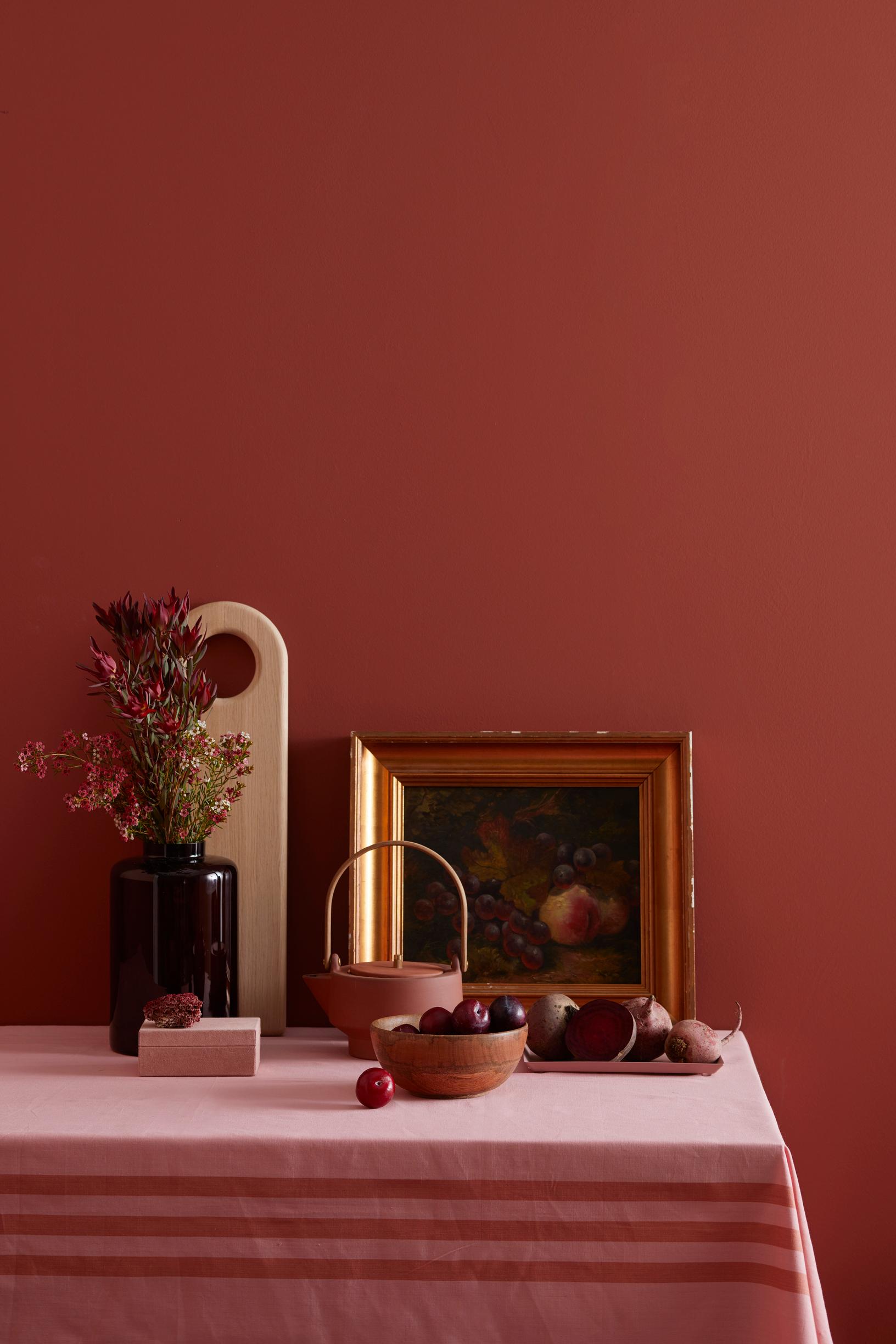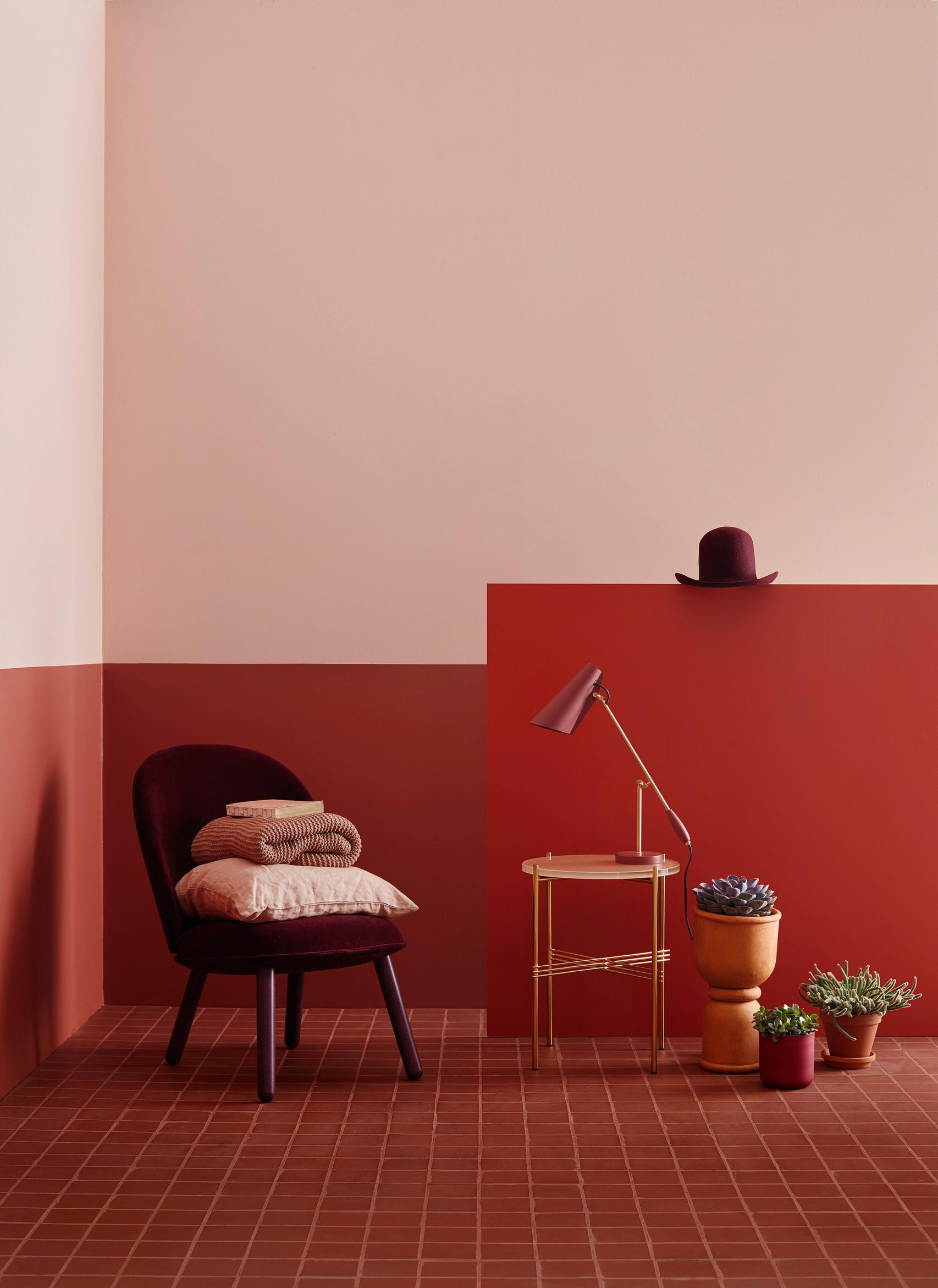 Puna- ja roseeviinin päihdyttävän ihanilla sävyillä on helppo irrotella, mutta pysyttele väriskaalassa ja suosi yksivärisiä esineitä. Normann Copenhagenin Ace-nojatuoli, Finnish Design Shop. Pellava-tyynynpäällinen ja Hiekka-huopa, Anno. Muistikirja, Moko. Gubin TS-sivupöytä, Zarro. Northern Lightingin Birdy-valaisin, Formverk. Hanna Sarénin Én-hattu, Xmas Garage. Mix & Match -ruukkusetissä on kaksi ruukkua ja kaksi rengasta, Tero Kuitunen. Punainen metalliruukku H & M Home. Natura-sarjan neliölaatta verkossa (PNM300622NET), Pukkila. Seinät on maalattu Tikkurilan Harmony-maaleilla: tumma L416, vaalea X410 ja seinäke L412.
