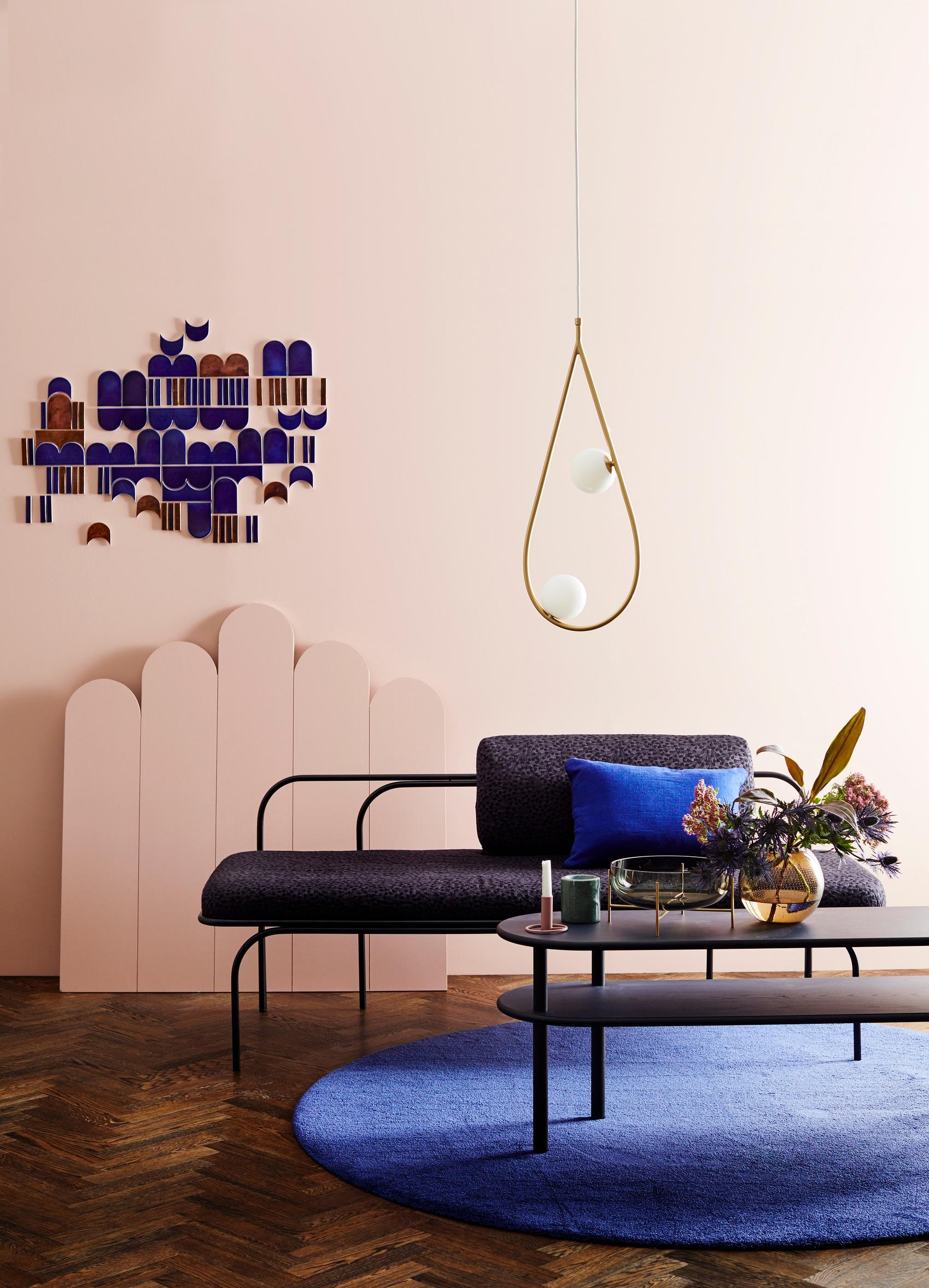 Intensiivinen sininen ja hento roosa ovat ihastuttava pari. Kun keskityt kahteen pääväriin, lisää vain ripaus muita sävyjä. Fringe-peili, tiedustelut Tero Kuitunen. Aytmin pisaranmuotoinen Stilla-rahi, Formverk. Lapuan kankureiden Saaga uni -mohairhuopa, Xmas Garage. Fjäder-tyynynpäällinen, Hemtex. Muistikirja, Moko. Marmoriset purkki ja kynttilänjalka, Anno. &Traditionin Hoof-sohvapöytä, Formverk. Menun marmorinen Hover-tarjoiluastia, Finnish Design Shop. Yuki-maljakko, Wild Things. Tillställning-lautasliinateline, Ikea. Koristekivi, Proloque. Seinässä on Tikkurilan Harmony sävy M354.