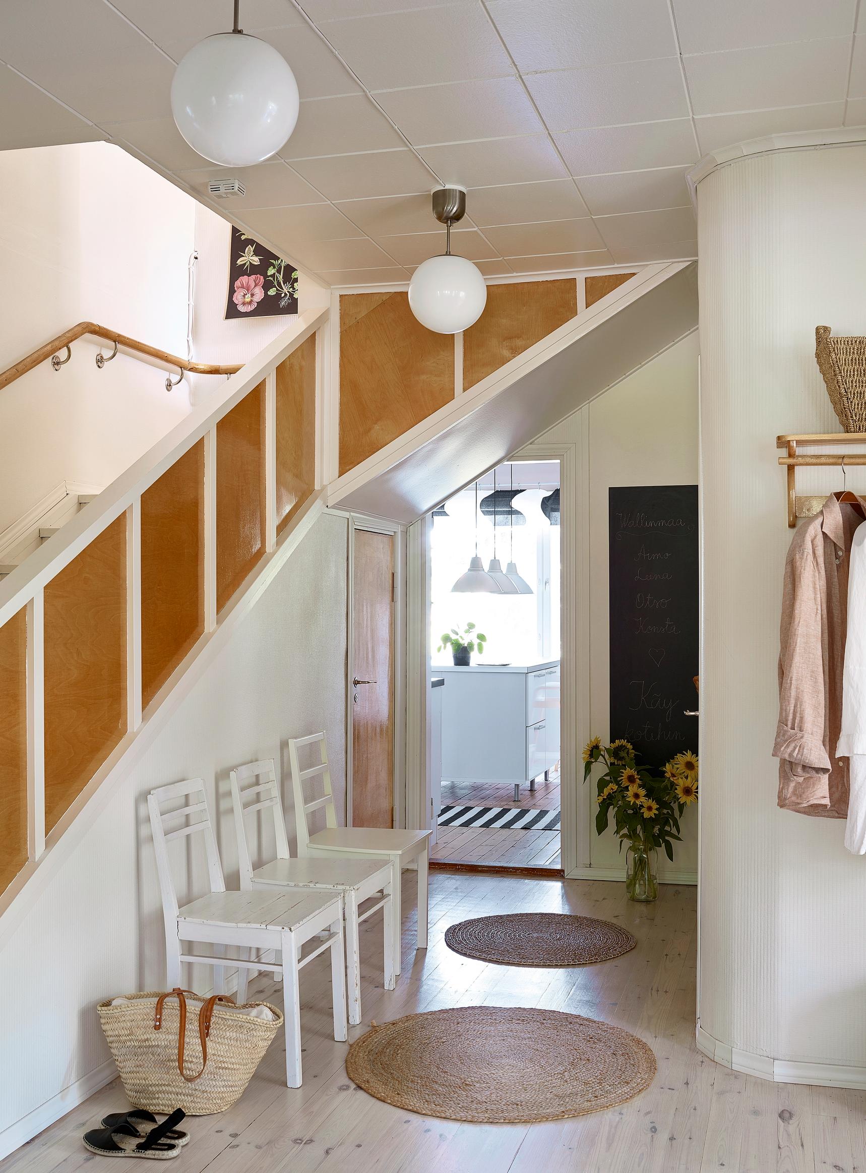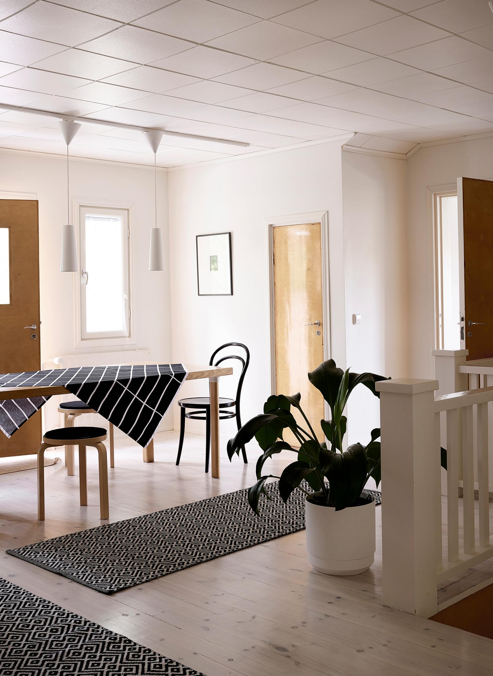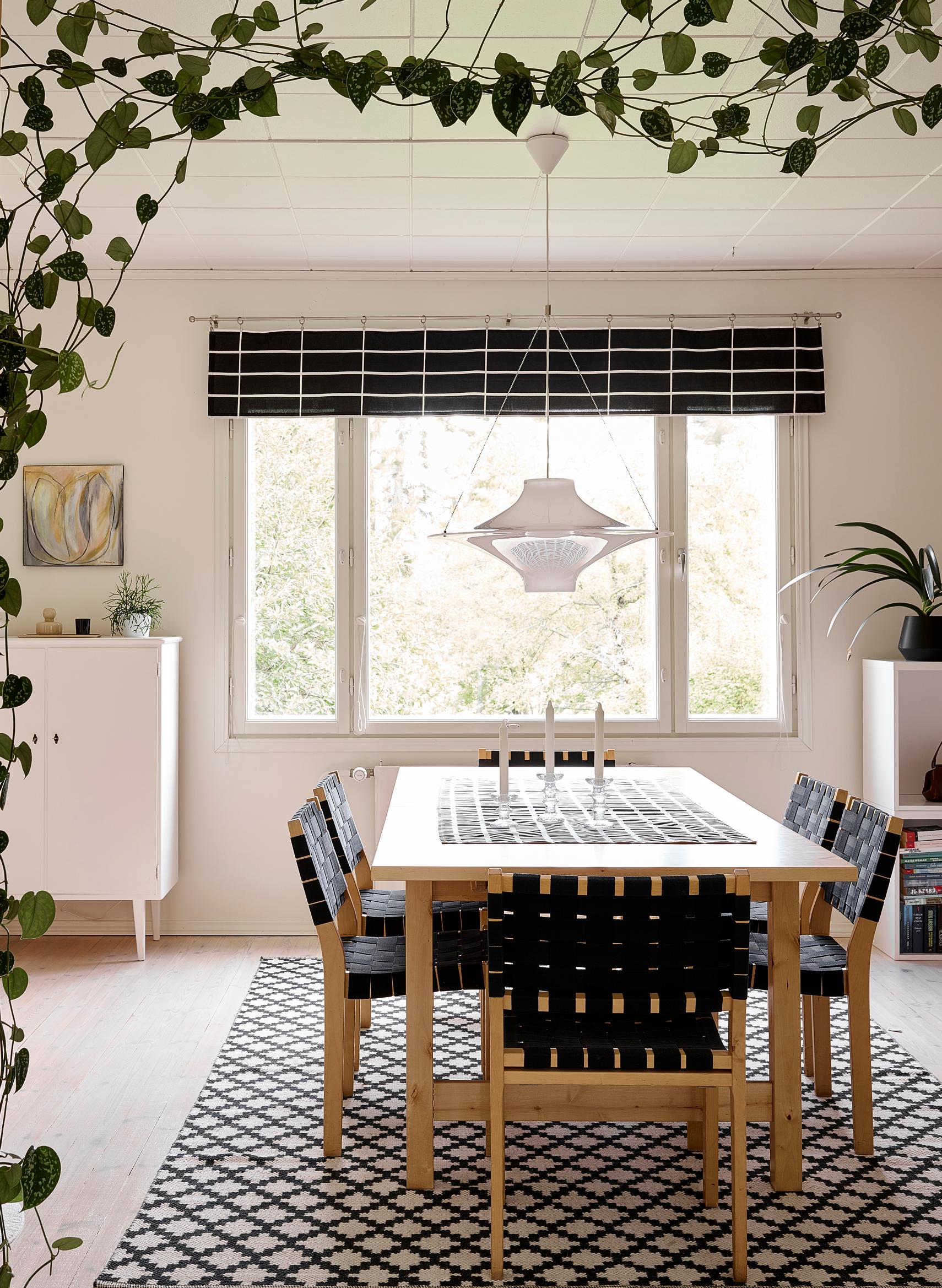 Olemme halunneet kunnioittaa talon alkuperäistä tunnelmaa ja sävymaailmaa. Sisustus on eleetön ja henkii 50-luvun vaikutteita. Se on muotoutunut pala palalta erilaisten löytöjen ja alkuperäisten kalusteiden yhdistelmänä. Viimeisimmät hankinnat ovat olleet koulun remonttimyyjäisistä hankitut Artekin ruokailuryhmän tuolit. Talo on varmasti kehittänyt omaa silmääni sisustajana.