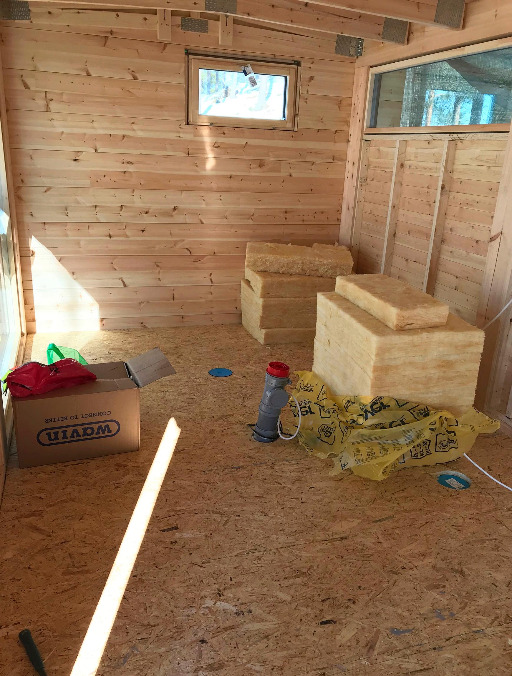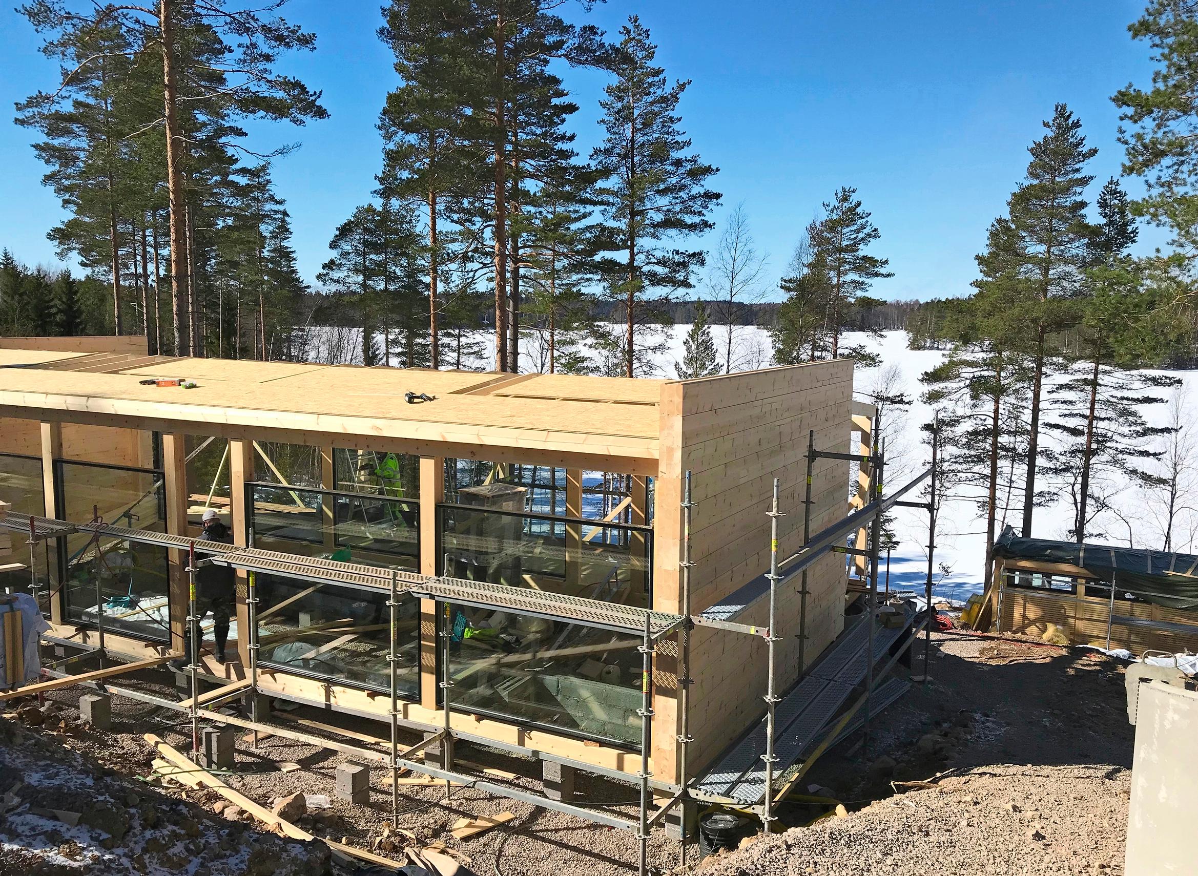 Mökin runko tuli talotehtaalta ”säältä suojaan” -toimituksena: asentajien poistuessa runko, vesikatto, ovet ja ikkunat olivat paikoillaan.