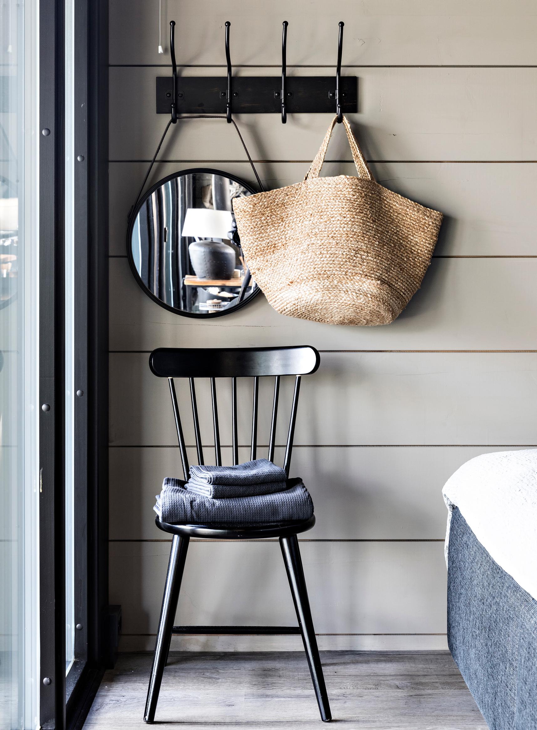 Katille on tärkeää, että sisustus antaa tilaa ikkunoista näkyvälle luonnon kauneudelle. Pääväreiksi hän valitsi mustan ja savenharmaan. Muut värit saavat tulla maisemasta, joka muuttuu päivän- ja vuodenaikojen mukaan.