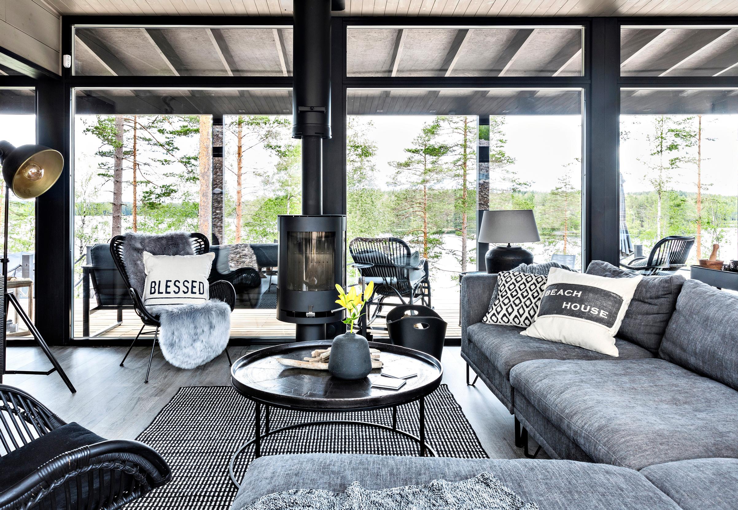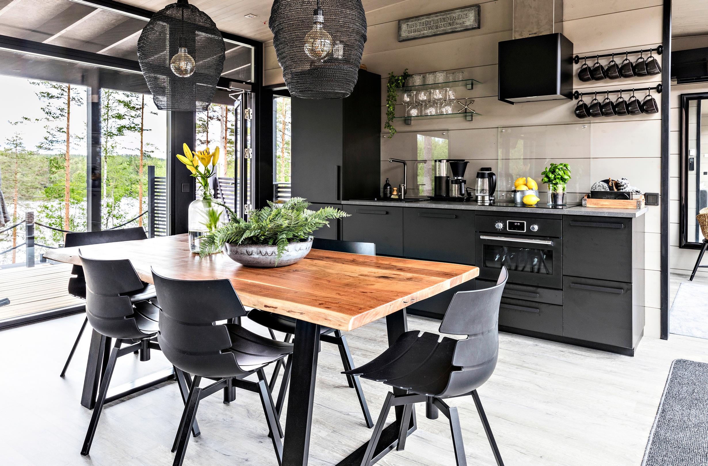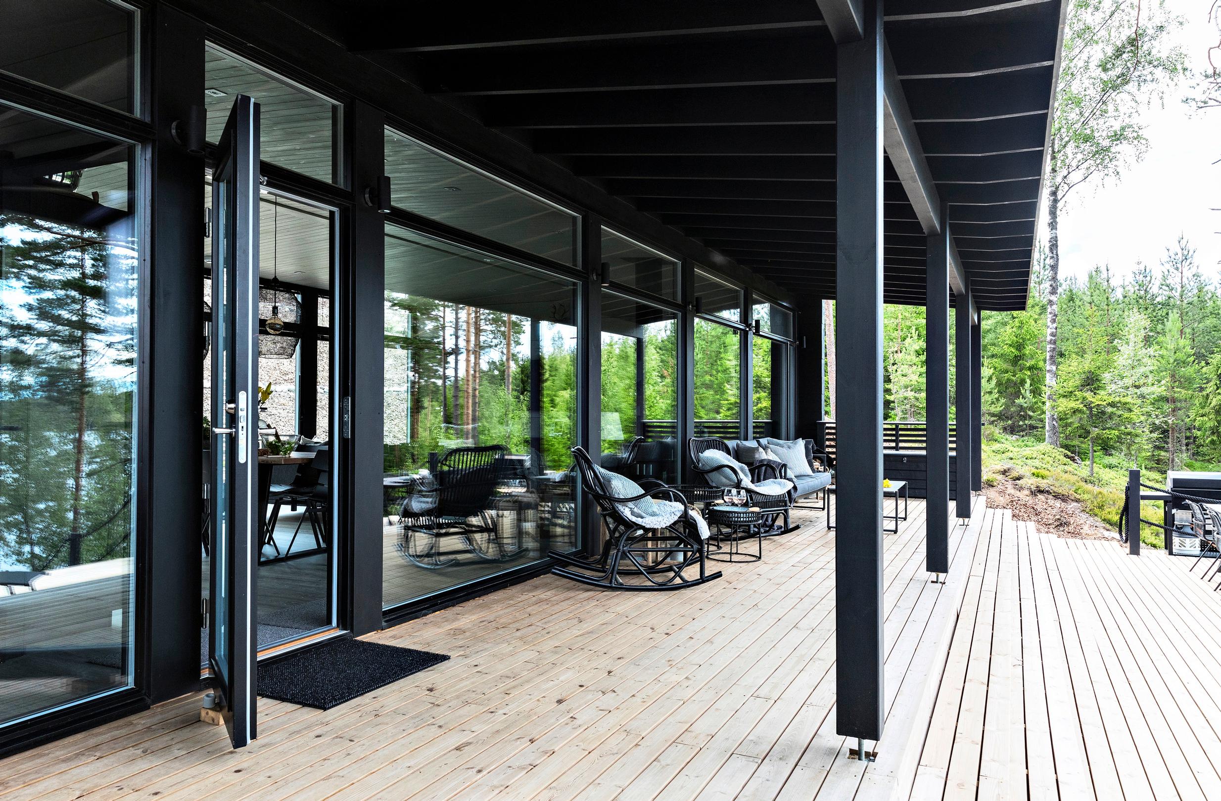 – Hirsi on lämmin, kestävä ja hyvännäköinen, ja puumateriaali sopii suomalaiseen luontoon. Musta väri sujahtaa taustaansa niin hyvin, että järveltä katsoessa mökkiä ei miltei huomaa, Kati toteaa.