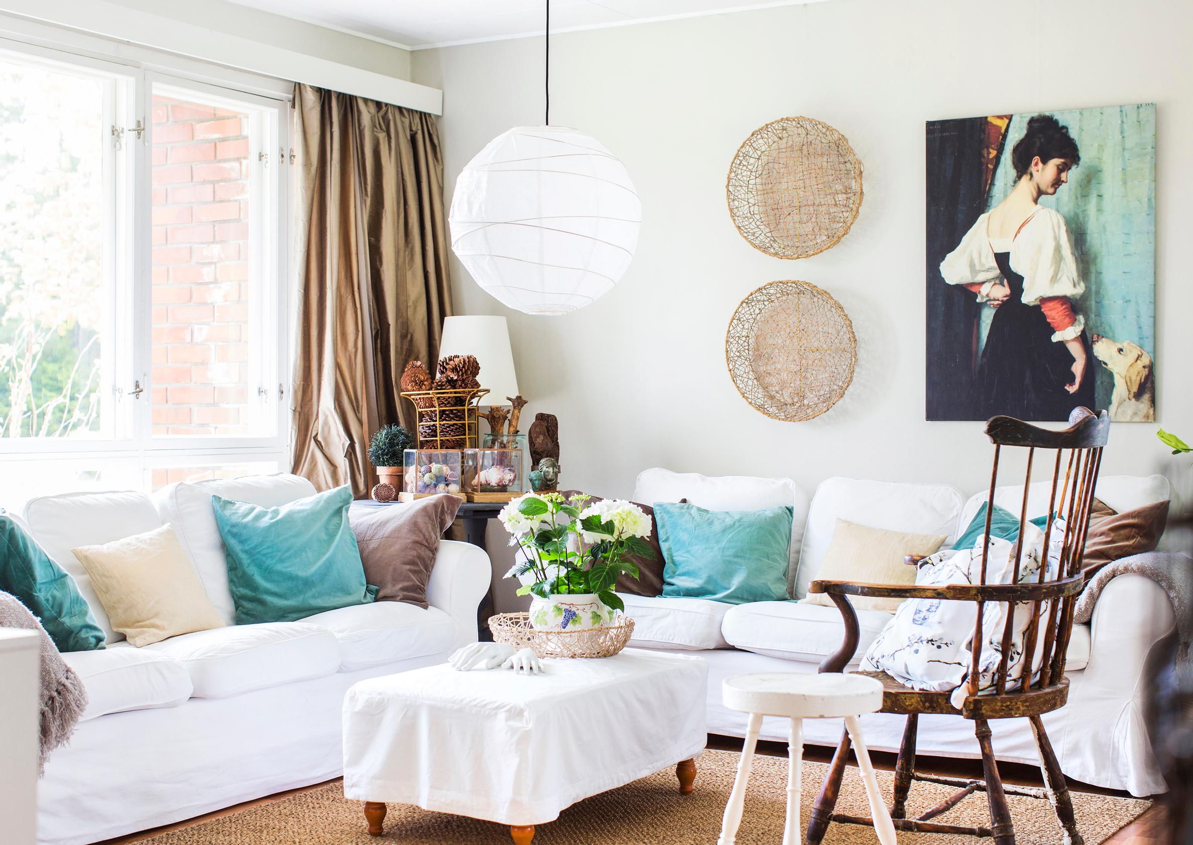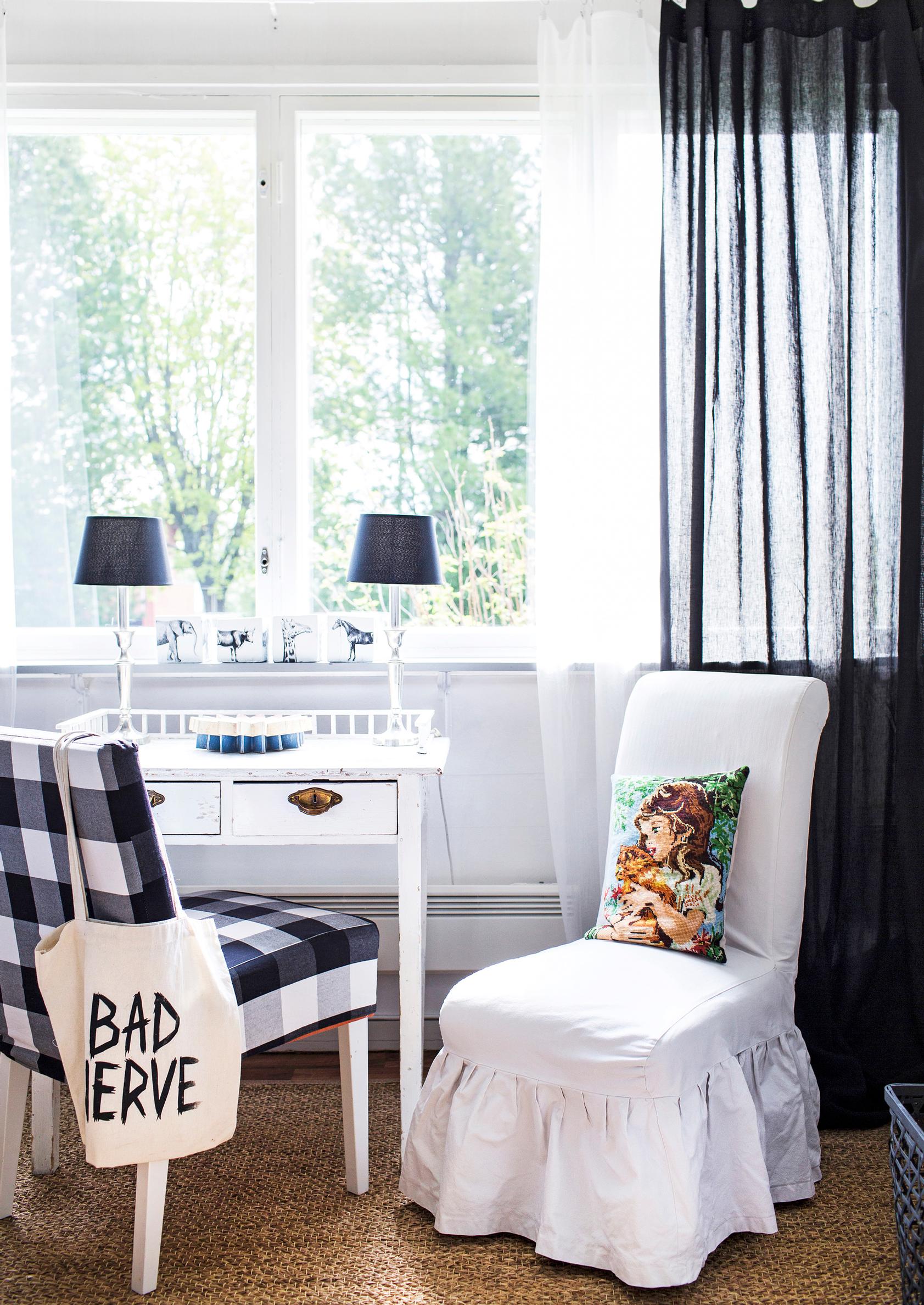 Huonekalut ovat peräisin mikä mistäkin. Keittiön pieni pöytä on ostettu lopetetusta liikkeestä viidellä eurolla. Verhoiksi on ripustettu pöytäliinat. Kerroksellisuus syntyy vanhoista esineistä, joilla on kauniita tarinoita kerrottavanaan.