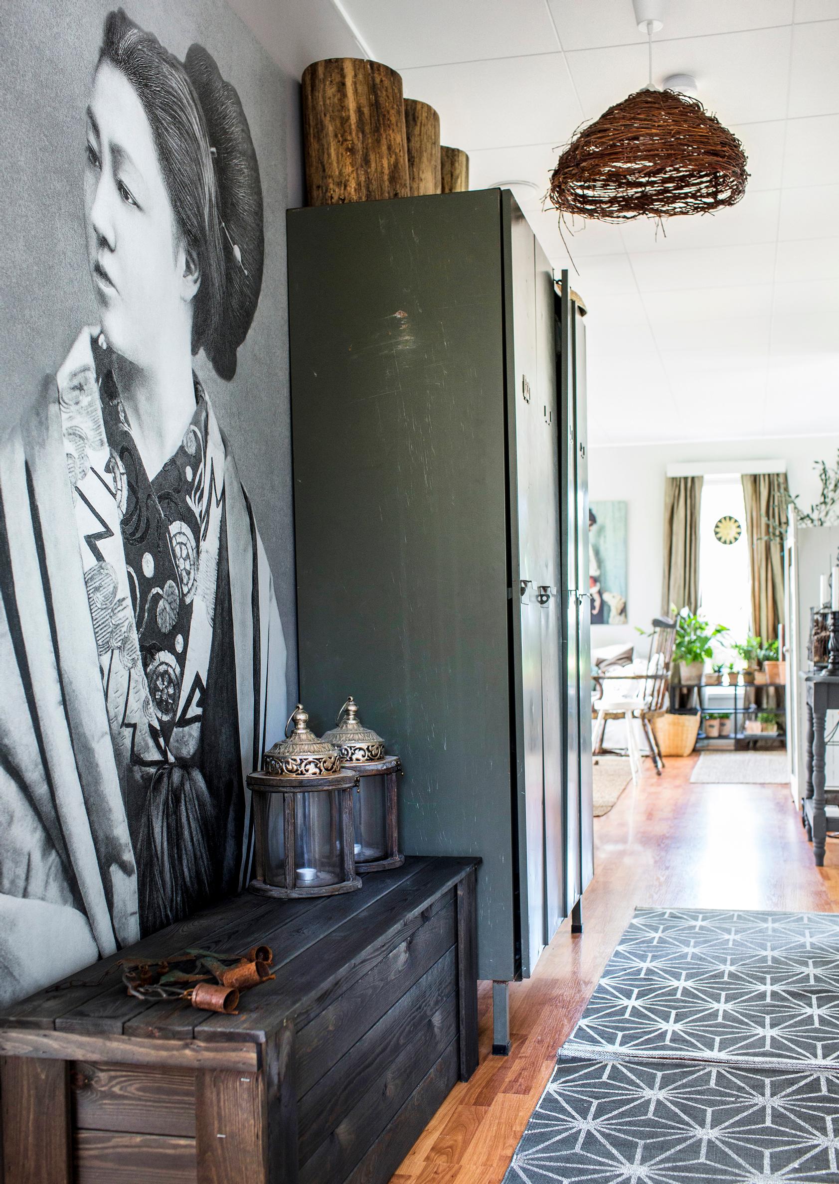 Tarja paneutuu huolellisesti näkymiin tilasta toiseen. Hän teetti eteisen tapetin Photowallissa vanhasta valokuvasta, jonka hän latasi hollantilaisen Rijksmuseumin nettisivuilta. Lataaminen on sallittua omaan käyttöön. Risuvarjostin ja puupölkyt kaapin päällä antavat sileille muodoille rouheaa kontrastia.