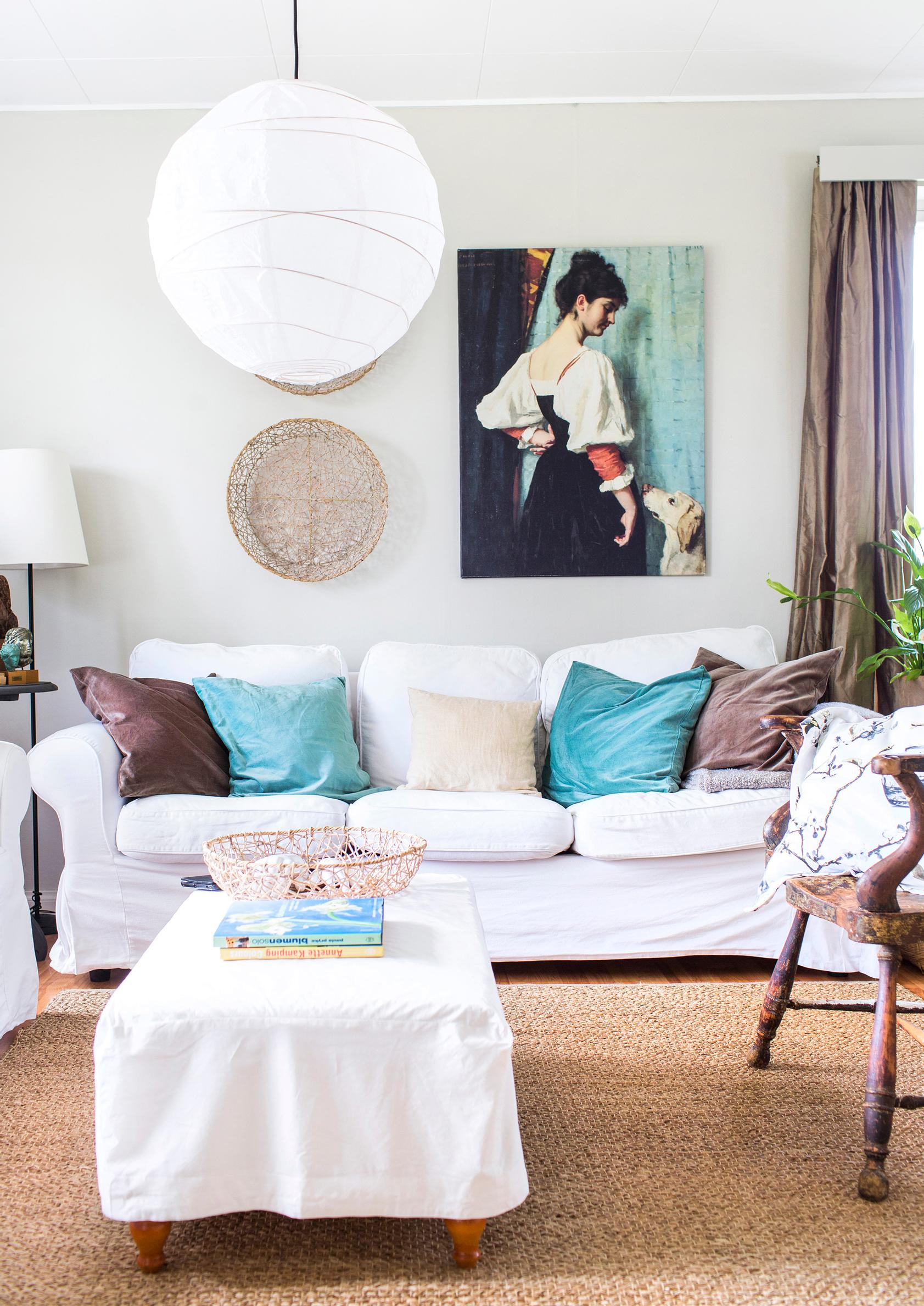 1800-luvun maalaus on antanut sykäyksen olohuoneen värimaailmaan. Tarja latasi kuvan Rijksmuseumin sivuilta ja teetti siitä taulun puulevylle.  Seinäväri on valittu keittiön tapetin mukaan ja on Tikkurilan värikartassa Piazza Y487.