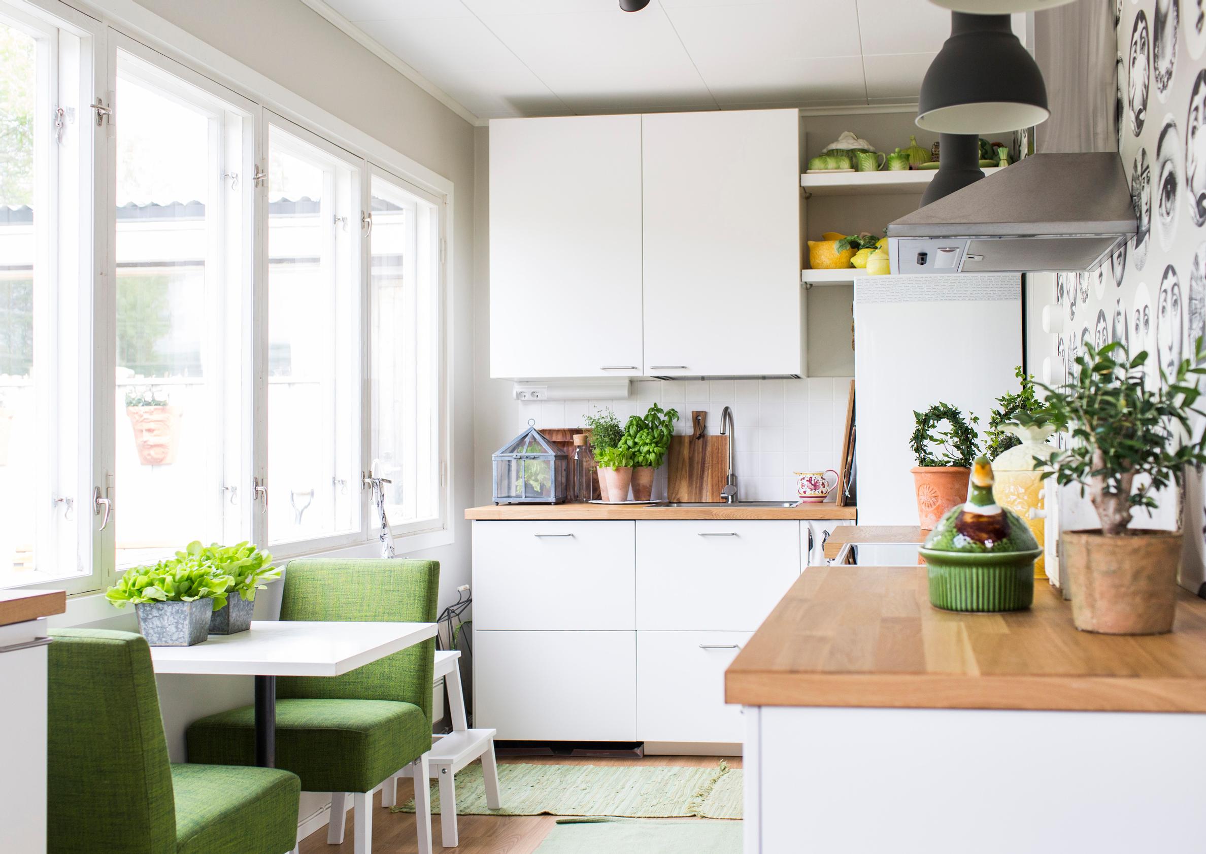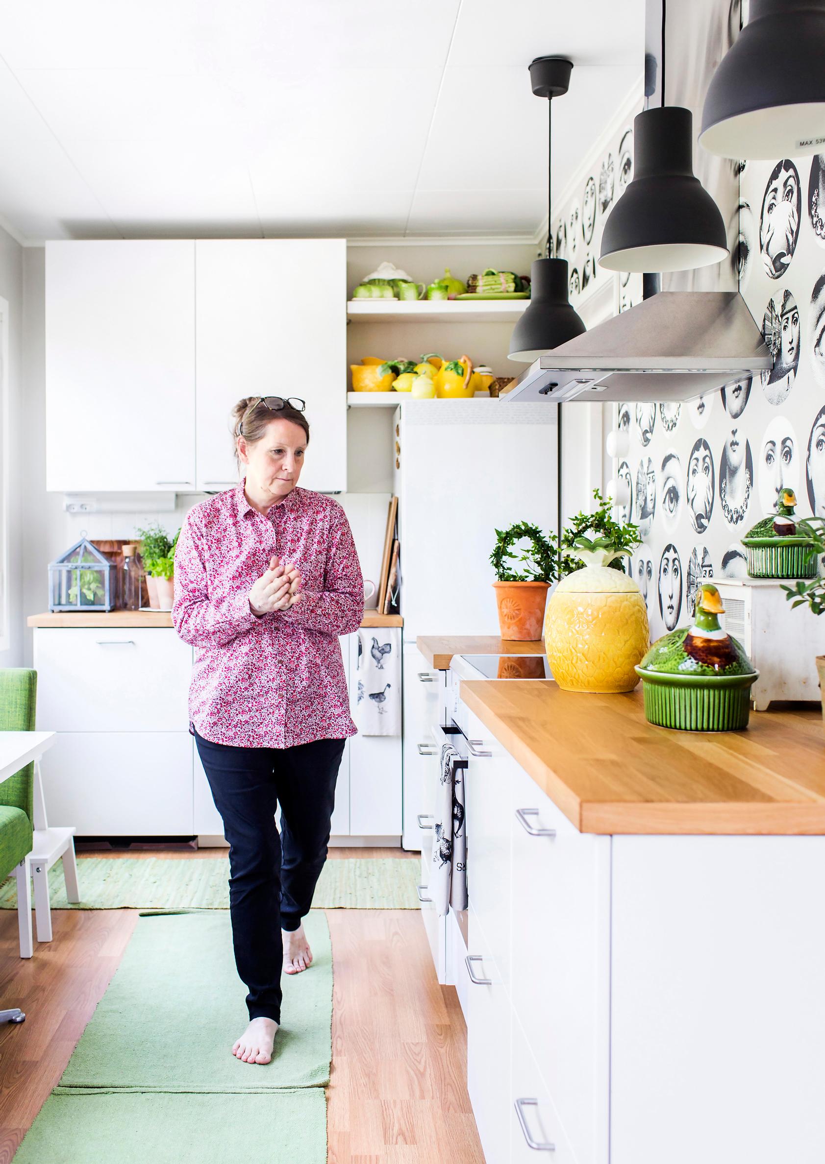 Tarja halusi keittiöstä alkuperäistä tilavamman, joten yksi seinä kaadettiin. Edelleenkin tilaa on aika vähän, mutta ainahan voi ajatella positiivisesti, että kaikki on käden ulottuvilla. Tarja hankki keittiöön valkoiset, edulliset kaapistot. Vastapainoksi tuli jännittävä tapetti. Vaikka remontti oli iso, kaikkea ei ole vielä saatu valmiiksi. Seuraavaksi on suunnitteilla julkisivun kunnostus.