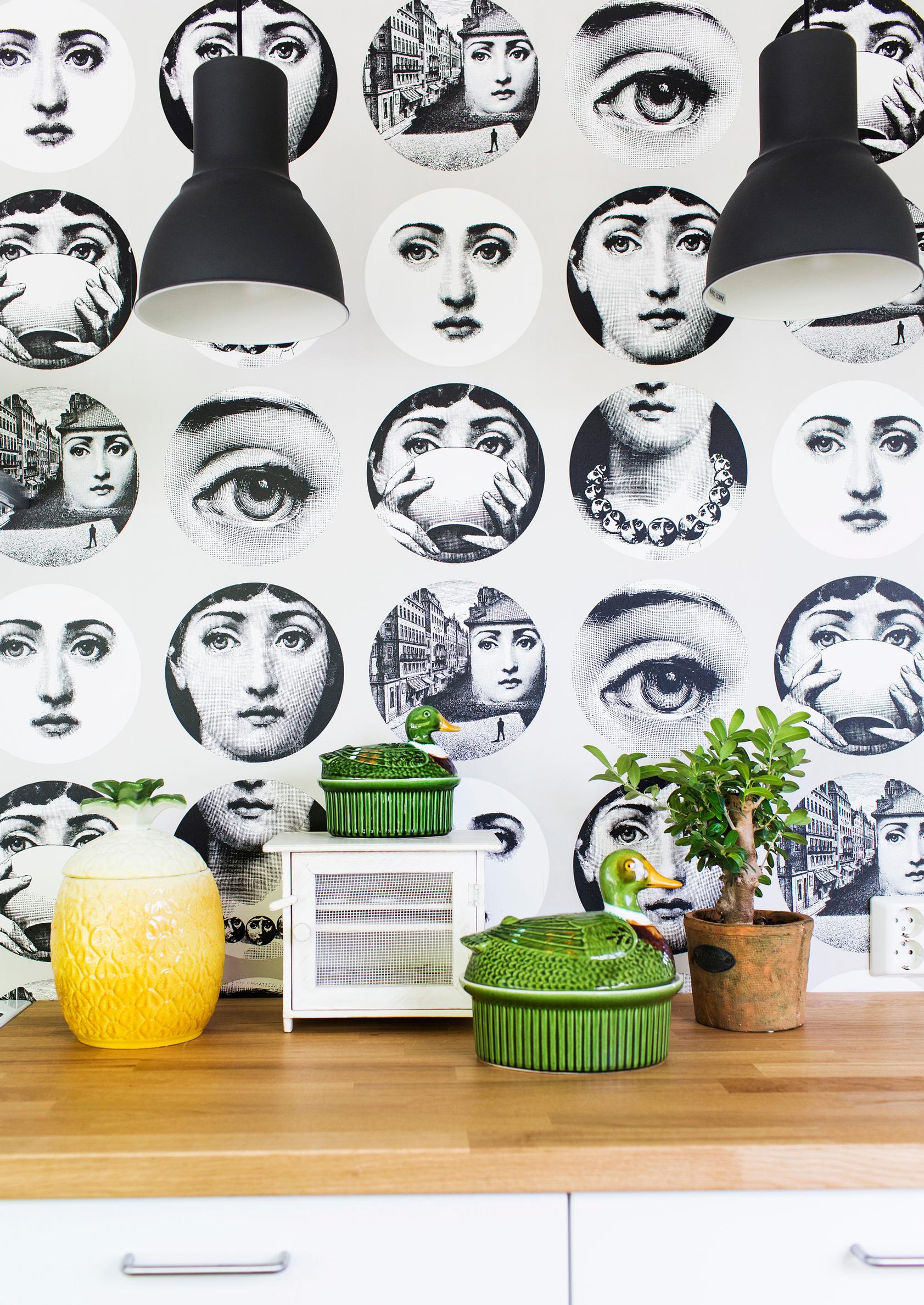 Cole & Sonin Urban-tapetti jäi yli rakennusmessujen sisustuskohteesta ja päätyi Tarjan keittiön seinälle.