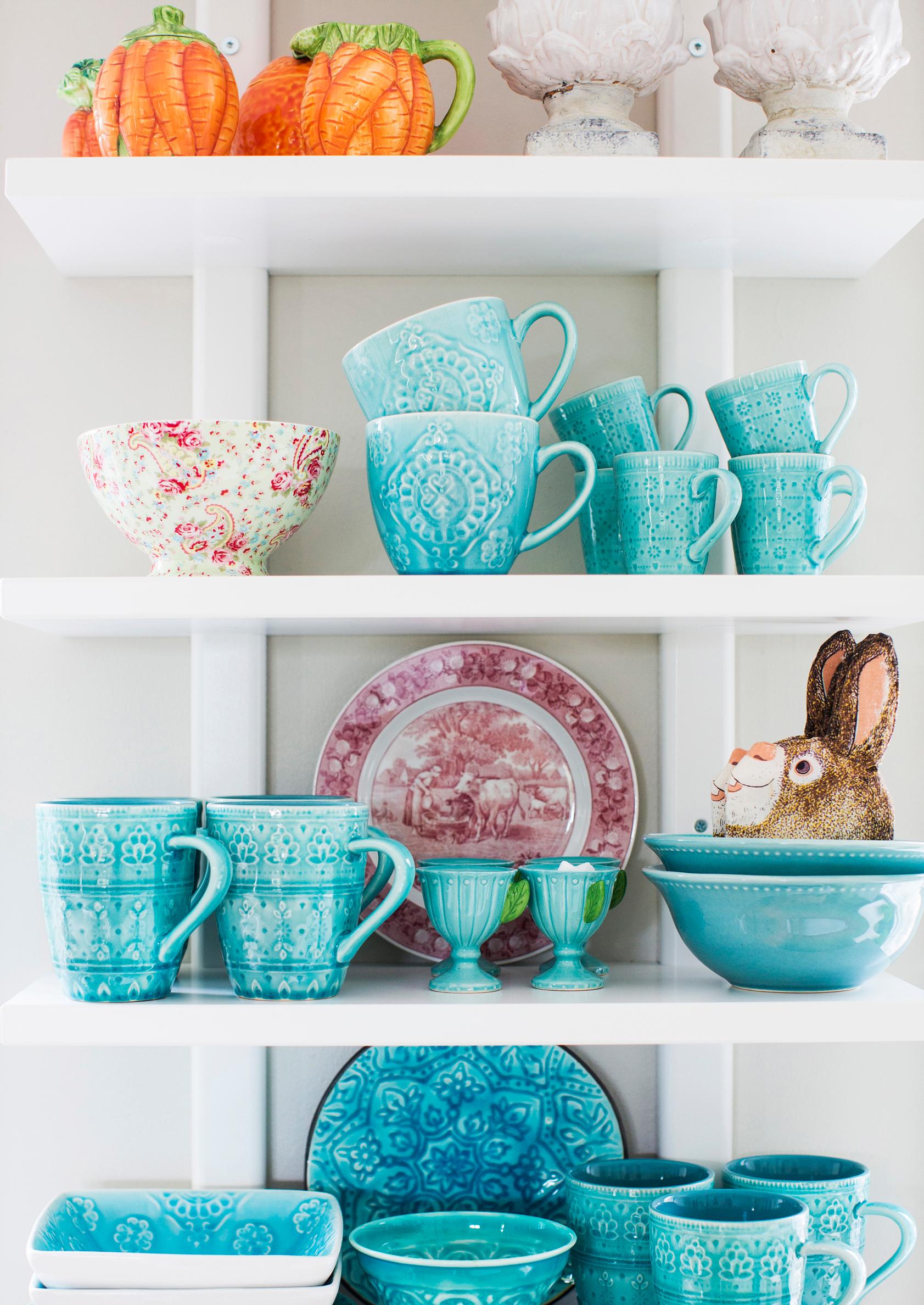 Turkoosi on kodin tehosteväri. Indiskan astiat avohyllyllä ovat keittiön iloinen väripilkku.
