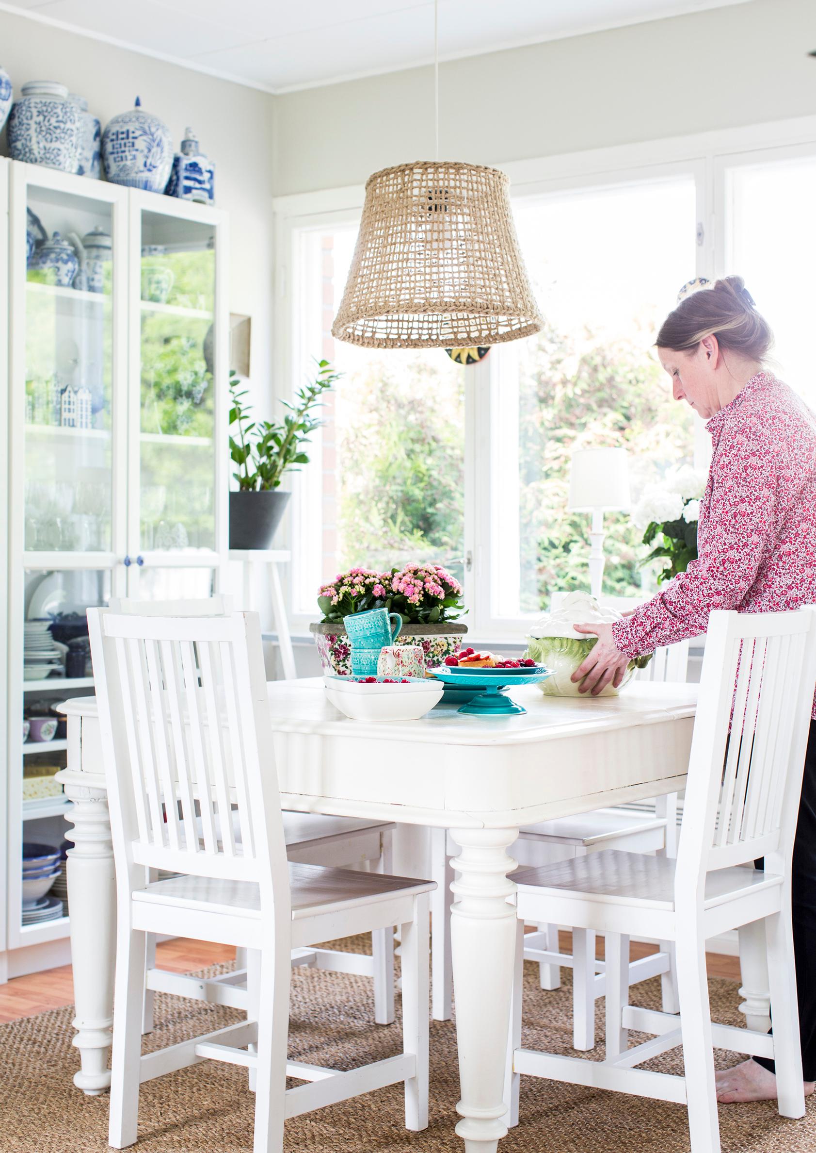 Ruokapöytä on Tarjalle rakas, sillä se on peräisin sukuhuvilalta. Kattovalaisin on tehty kiertämällä hamppunarua varjostinkehikon ympärille. Tarja innostui keräämään kiinalaistyylisiä ruukkuja perittyään äidiltään Arabian sinivalkoisen Singapore-astiaston. Niitä on jo hyvä kokoelma ruokailutilan vitriinissä.
