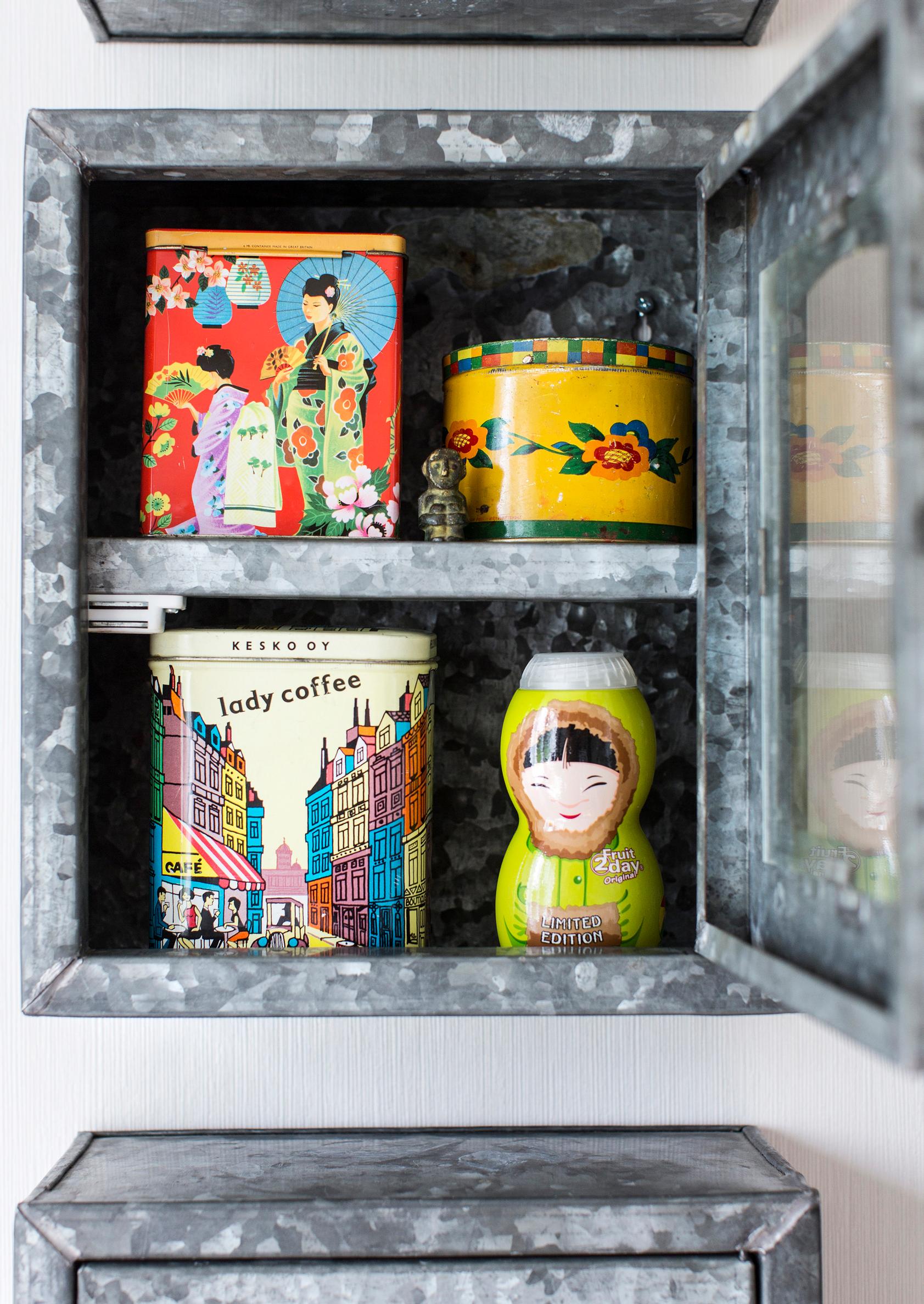 Muistot ovat esillä vierashuoneen seinäkaapeissa. Punainen teepurkki on aarre lapsuusajoilta.
