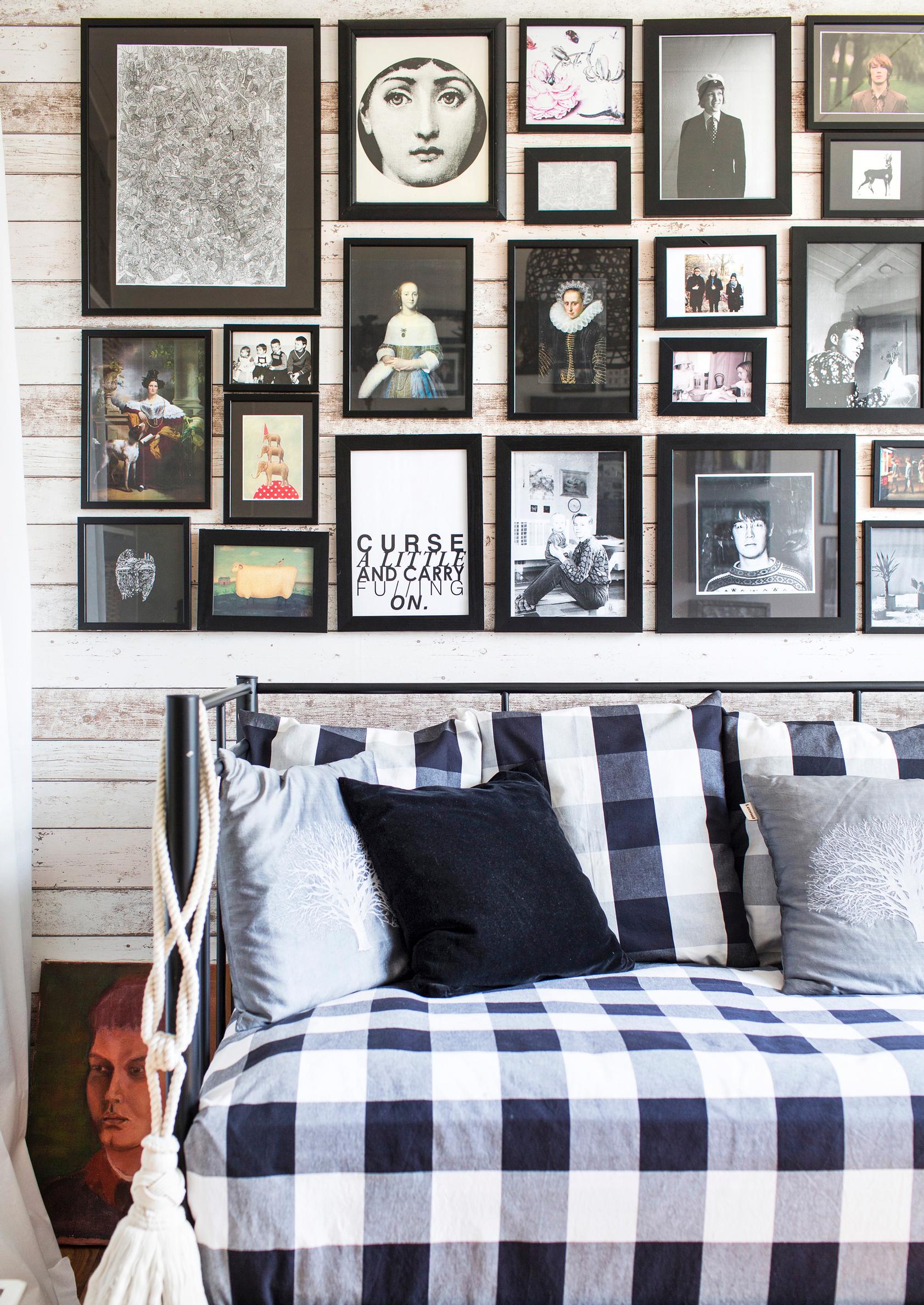 Vierashuoneelle on käyttöä, kun lapset tulevat käymään. Tarja kokosi seinälle ilmeikkään "valokuva-albumin".