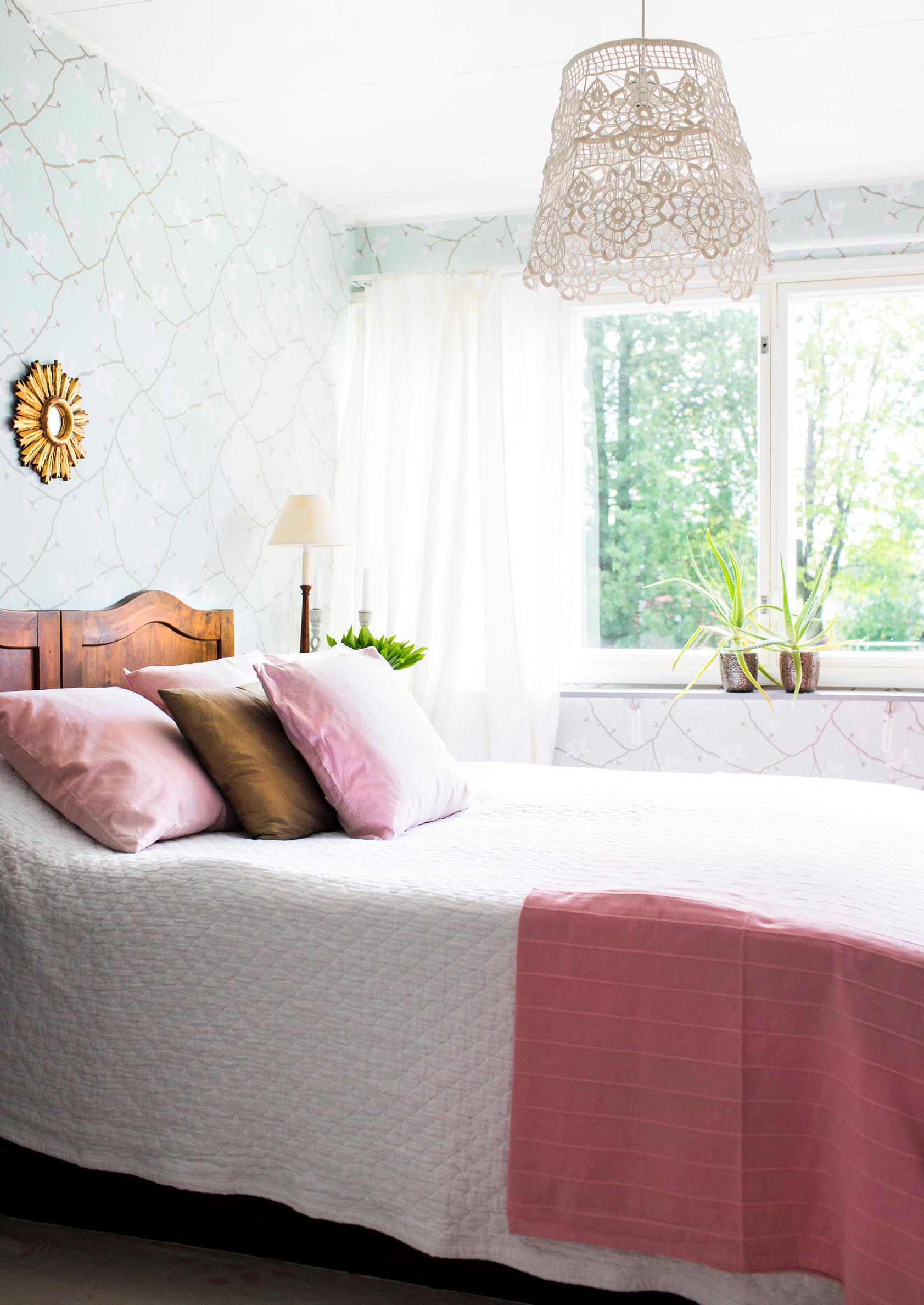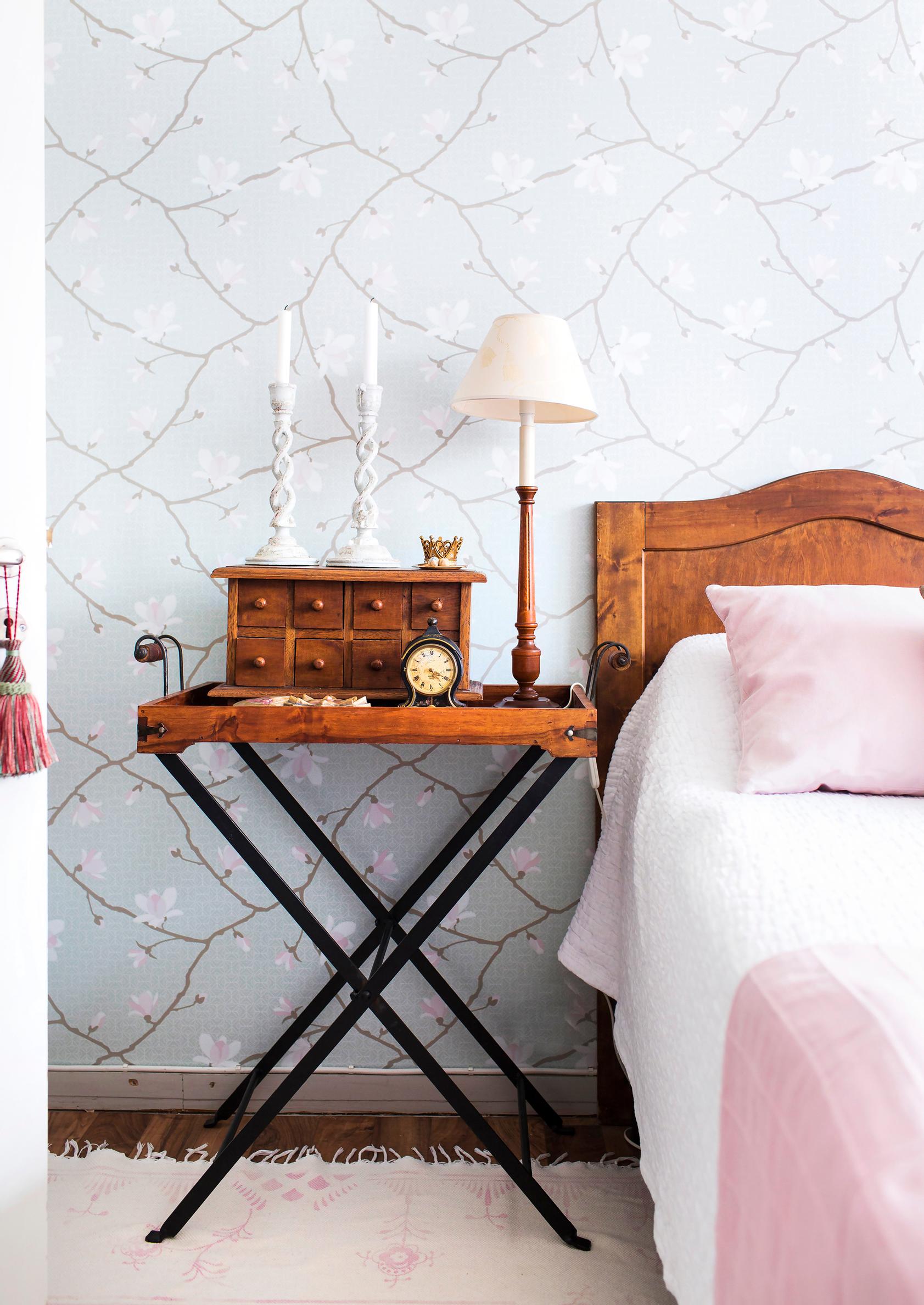 Yöpöydällä on vaihtuva näyttely. Romuromanttinen kello on kuulunut aikoinaan hänen äidilleen. Tapetti on Boråstapeterin Jubileum-malliston Magnolia.