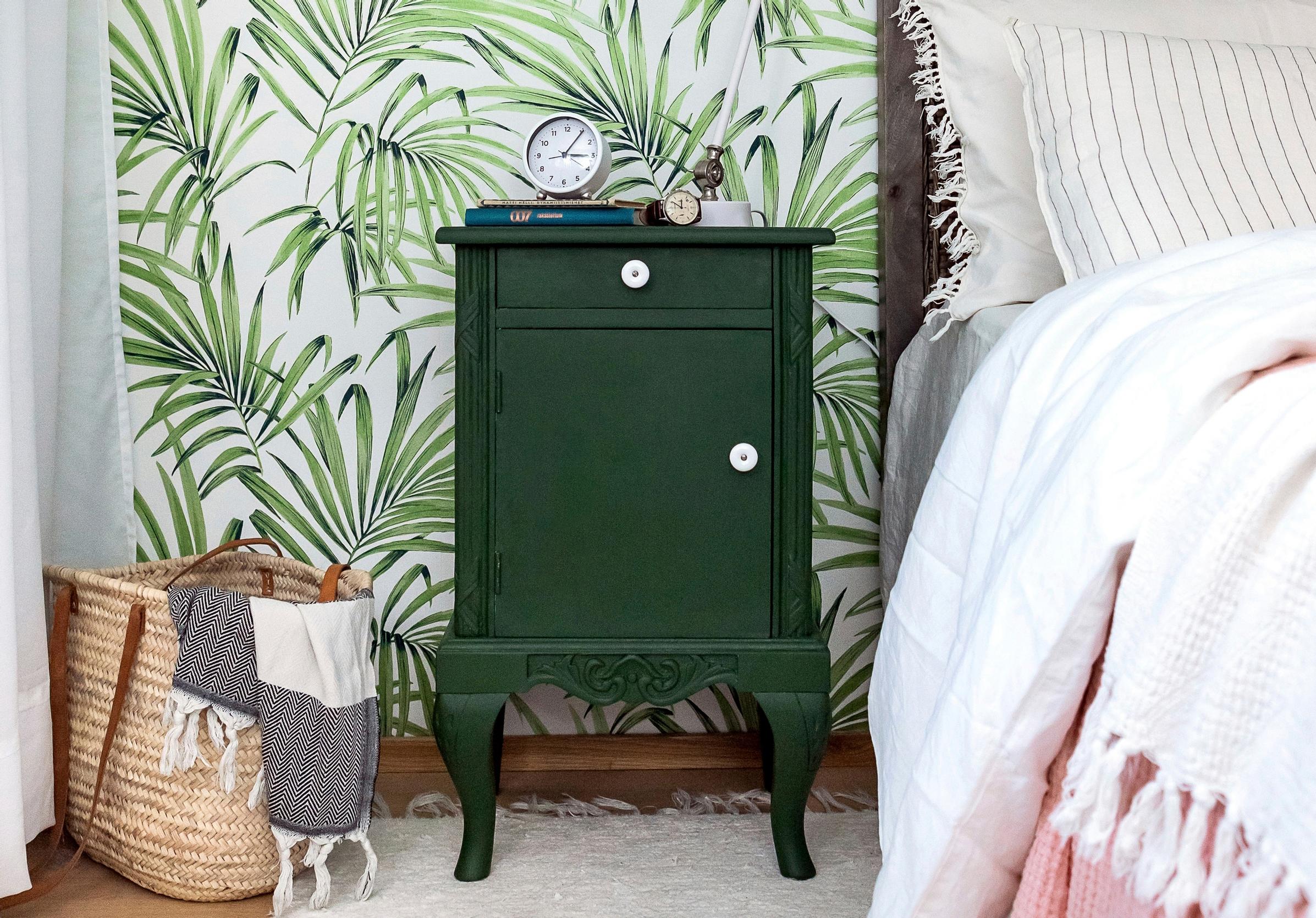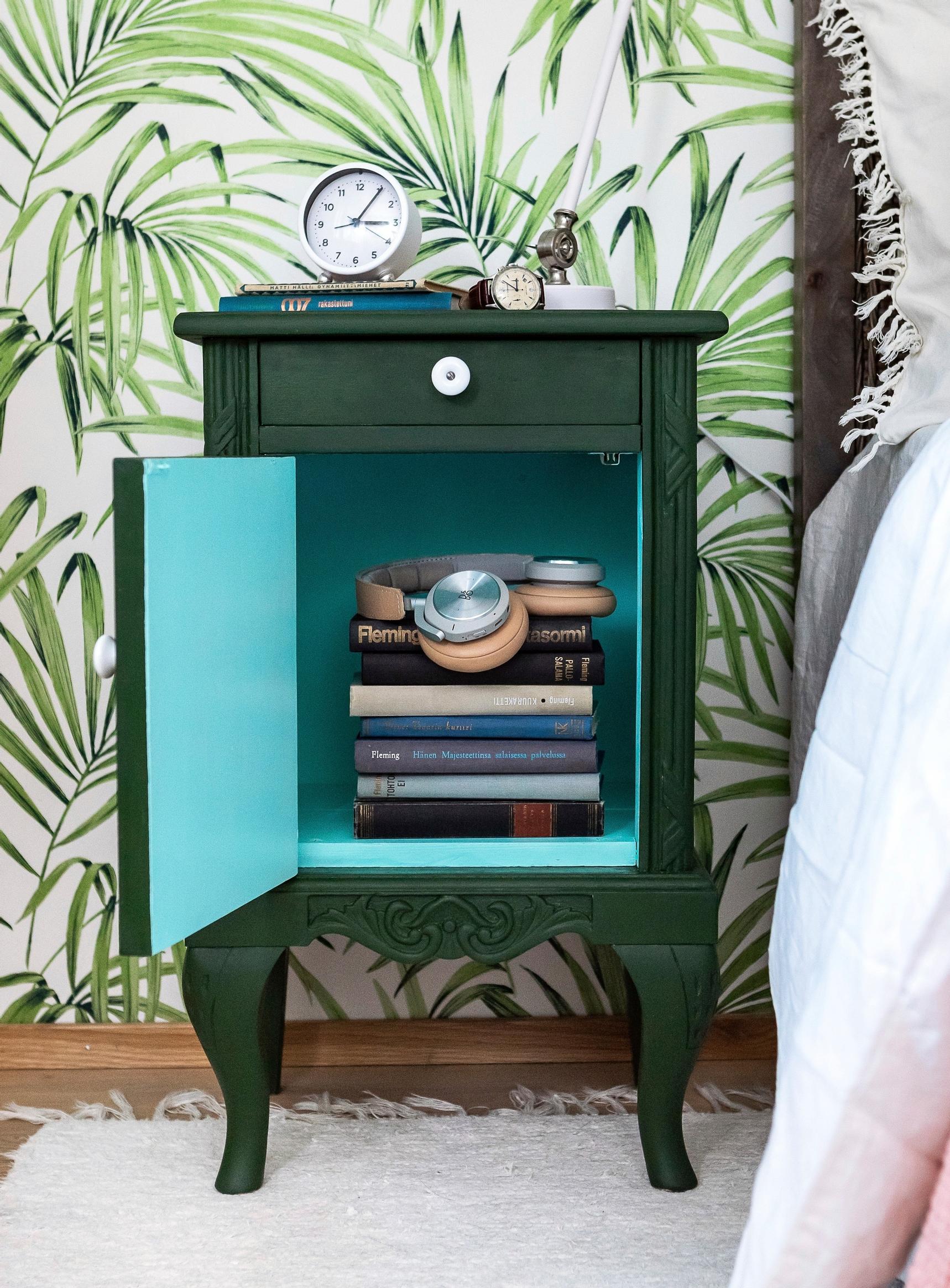Yöpöydän maalaus antaa vanhalle kalusteelle uutta ilmettä. Vahvan vihreät yöpöydät kuljettavat ajatukset lomakohteeseen. Kaapin sisällä odottaa yllätys, kun maalaat sen toisella värillä.