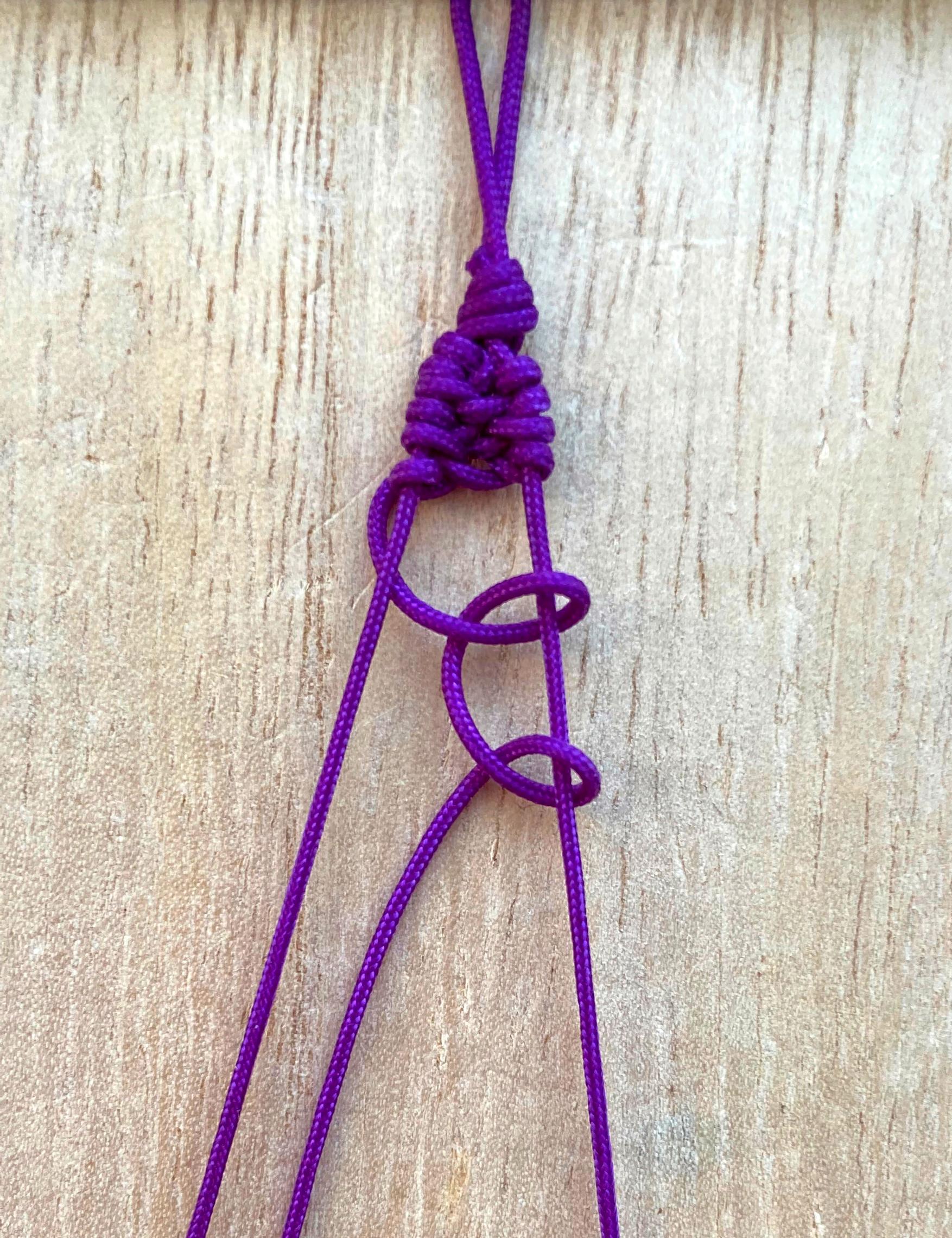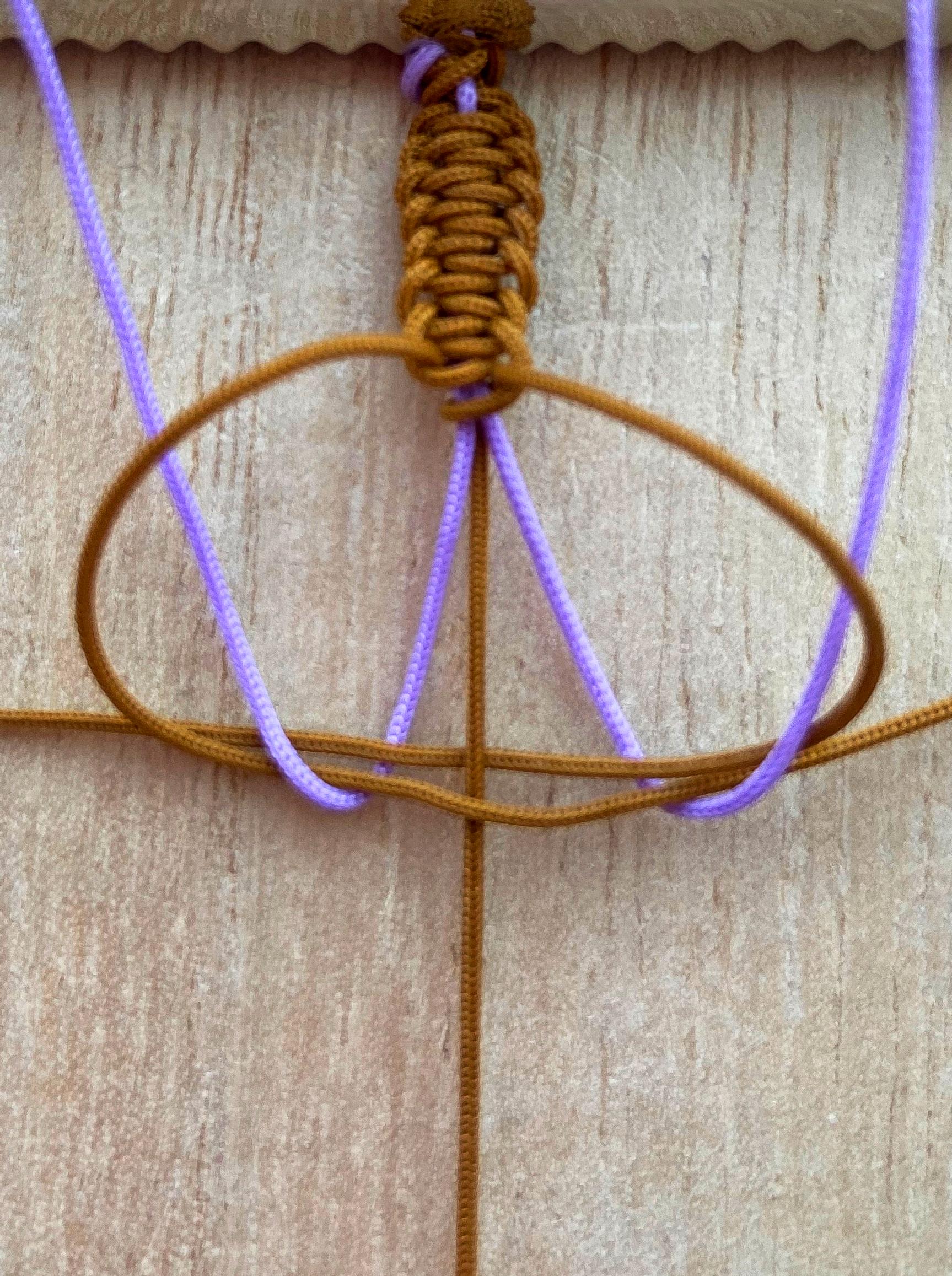 3. Tee sitten kukan alkusolmu kuten kuvissa: Erota keskinipusta liilat nyörit sivuille ja aseta ruskeat nyörit kulkemaan niiden päälle. Käännä vasemmanpuoleinen ruskea nyöri kulkemaan keskimmäisen nyörin yli ja oikeanpuoleinen keskimmäisen nyörin ali. Vedä sitten molemmat liilat nyörit ruskeiden sivunyörien alapuolelta niiden muodostamien lenkkien läpi. Kiristä ruskeat nyörit sivuille ja liilat ylöspäin.