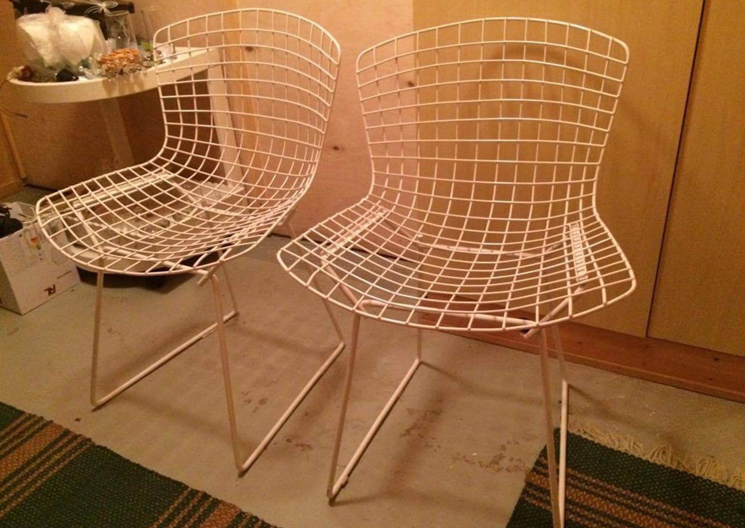 Nämä Harry Bertoian Side Chair -istuimet ovat olleet suosittuja viime aikoina. Huutokaupassa asettaisin tuoliparin lähtöhinnaksi 400 euroa. Uudelleenmaalaus ei pahemmin vaikuta arvoon tässä hintaluokassa. Jos tuoleissa olisi mukana alkuperäiset istumatyynyt, summa nousisi hieman. Myös mahdolliset alkuperäiset etiketit kannattaa tarkistaa.
