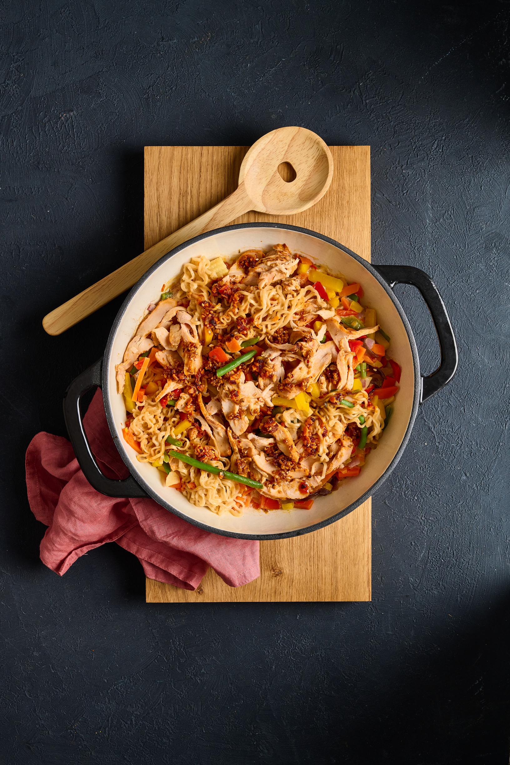 Nopean ruoan kaava on simppeli: mitään ei pilkota ja kaikki ainekset kootaan yhteen pataan. Näin tiskiäkin syntyy minimaalisesti. Vaikka raaka-ainelista on lyhyt, ruoasta ei puutu makua, sillä mausteena on makua pursuavaa rapeaa valkosipuli-chiliöljyä ja nuudelipakkausten omat maustepussit.