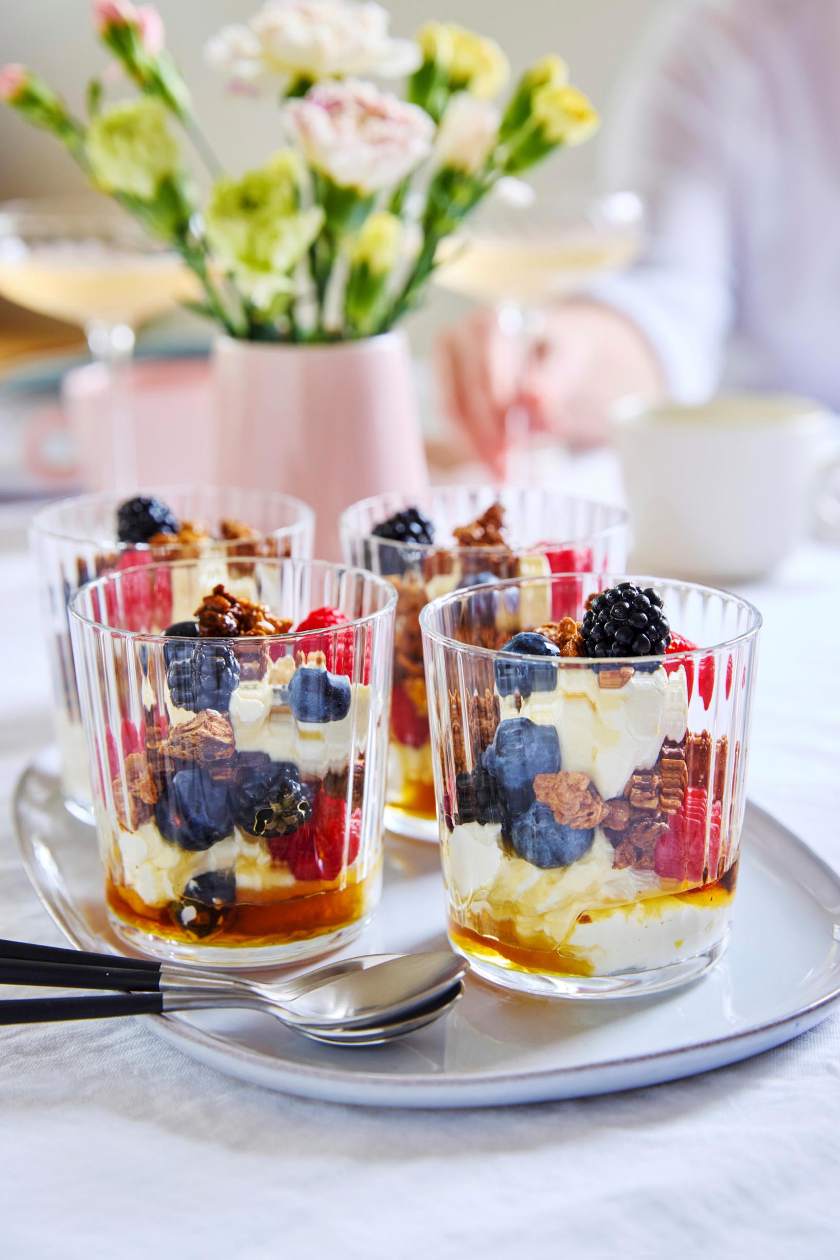 - Kokoa laseihin tai jälkiruokakulhoihin labnehia, tahinigranolaa ja marjoja kerroksittain. Valuta päälle vaahterasiirappia.