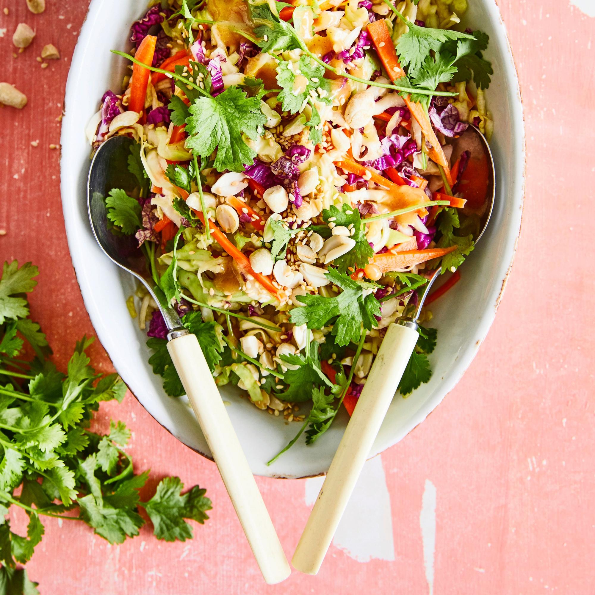 Aasialainen varhaiskaalislaw on perinteistä coleslawia raikkaampi lisuke, jossa majoneesi on korvattu pähkinäisellä kastikkeella. Kokeile salaattia vaikkapa tulisten broilerinsiipien tai porsaan ribsien kanssa!