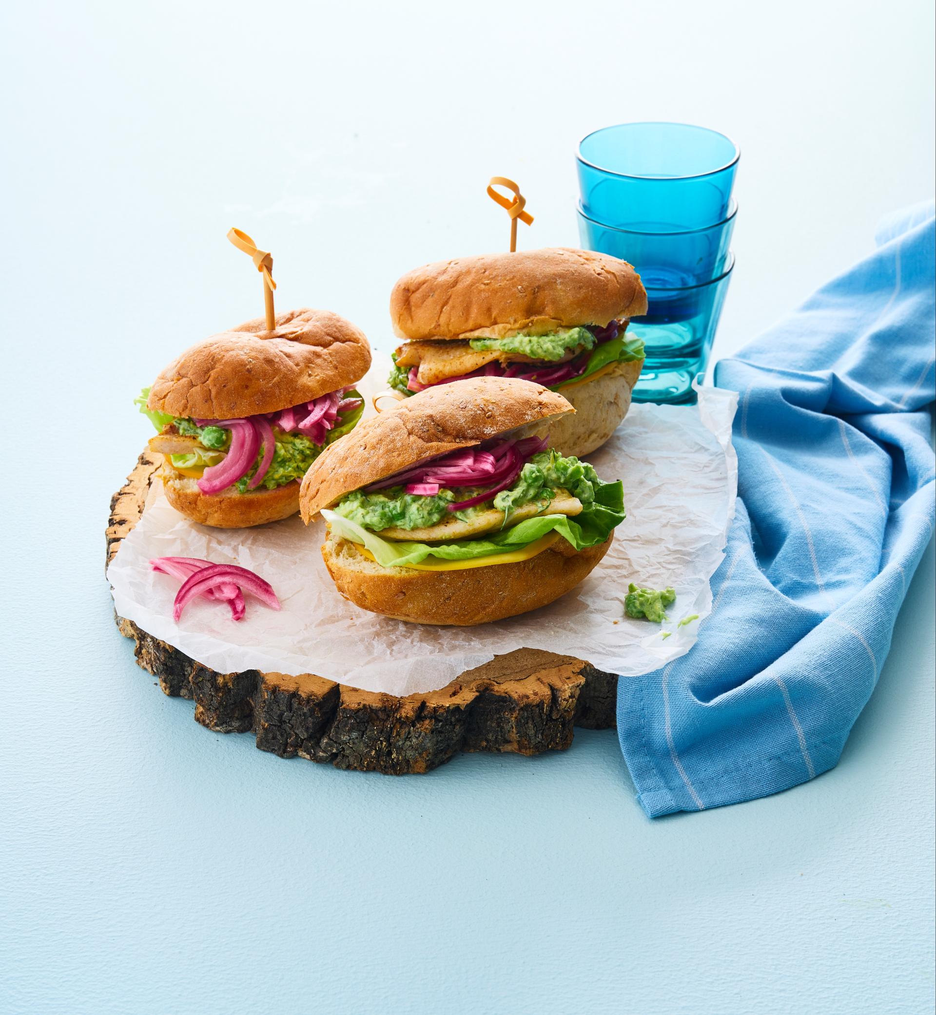 Ahvenburgerit täytetään voissa paistetuilla ahvenfileillä, savujuustolla, hernetsatsikilla ja pikkelöidyllä punasipulilla. Kokeile kesäkalapurilaisiin sämpylöiden sijaan myös ruisleipää!