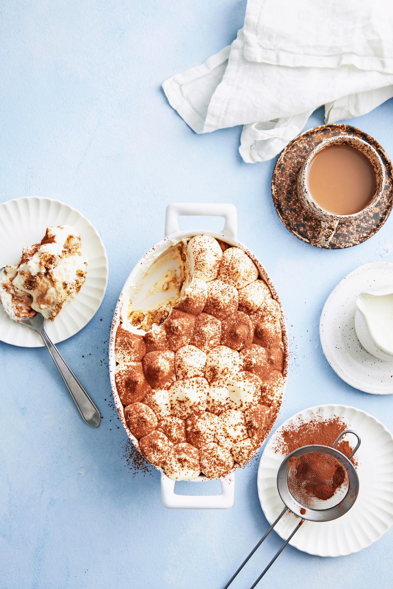 - Laita tiramisu jääkaappiin vähintään 3 tunniksi. Siivilöi kaakaojauhetta pinnalle ennen tarjoamista.