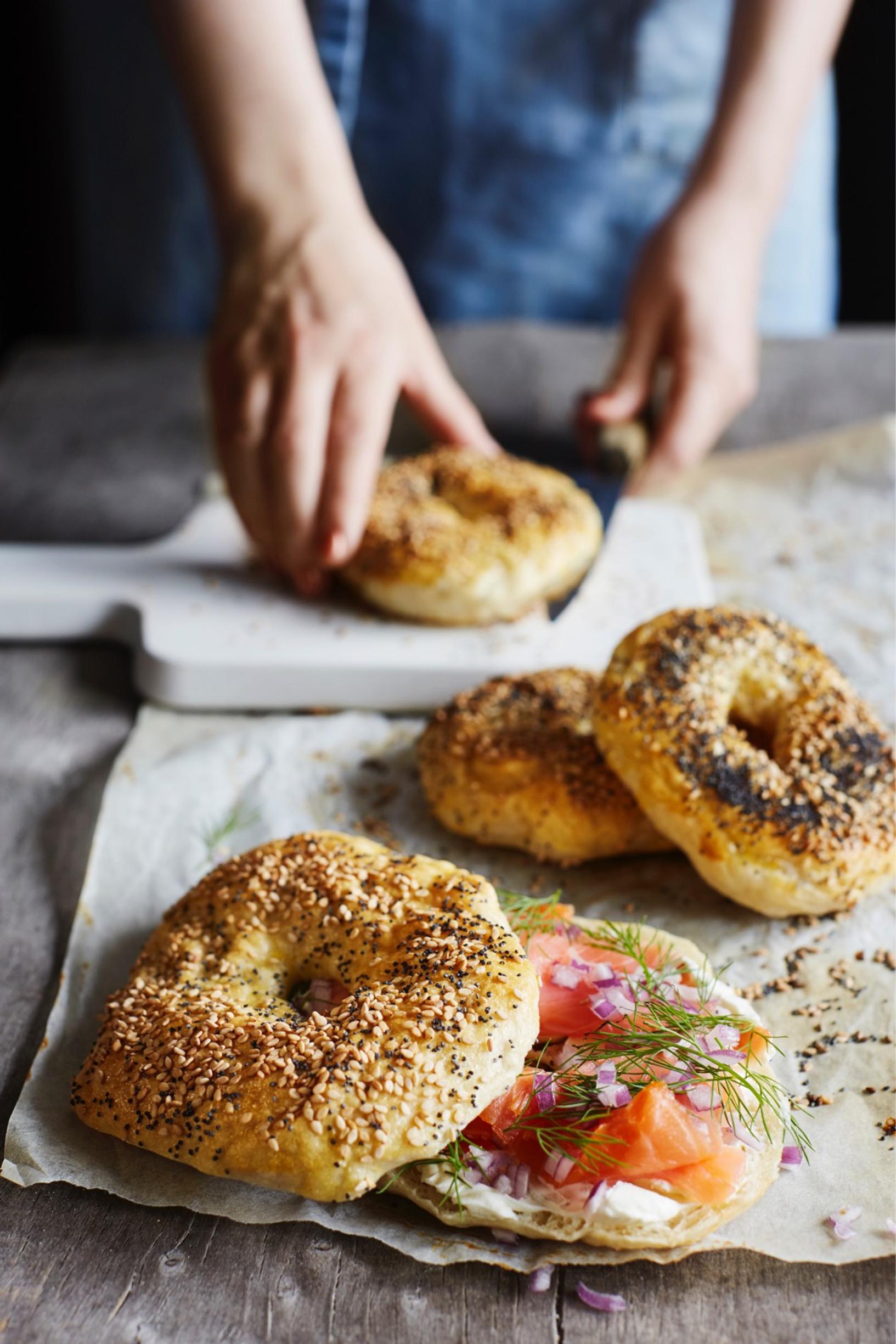 Bagelit saavat herkullisen makunsa pitkästä kohotuksesta. Vedessä keittämisen ja uunissa paistamisen yhdistelmä antaa bageleille herkullisen rakenteen. Kokeile bageleihin omia lempitäytteitäsi.