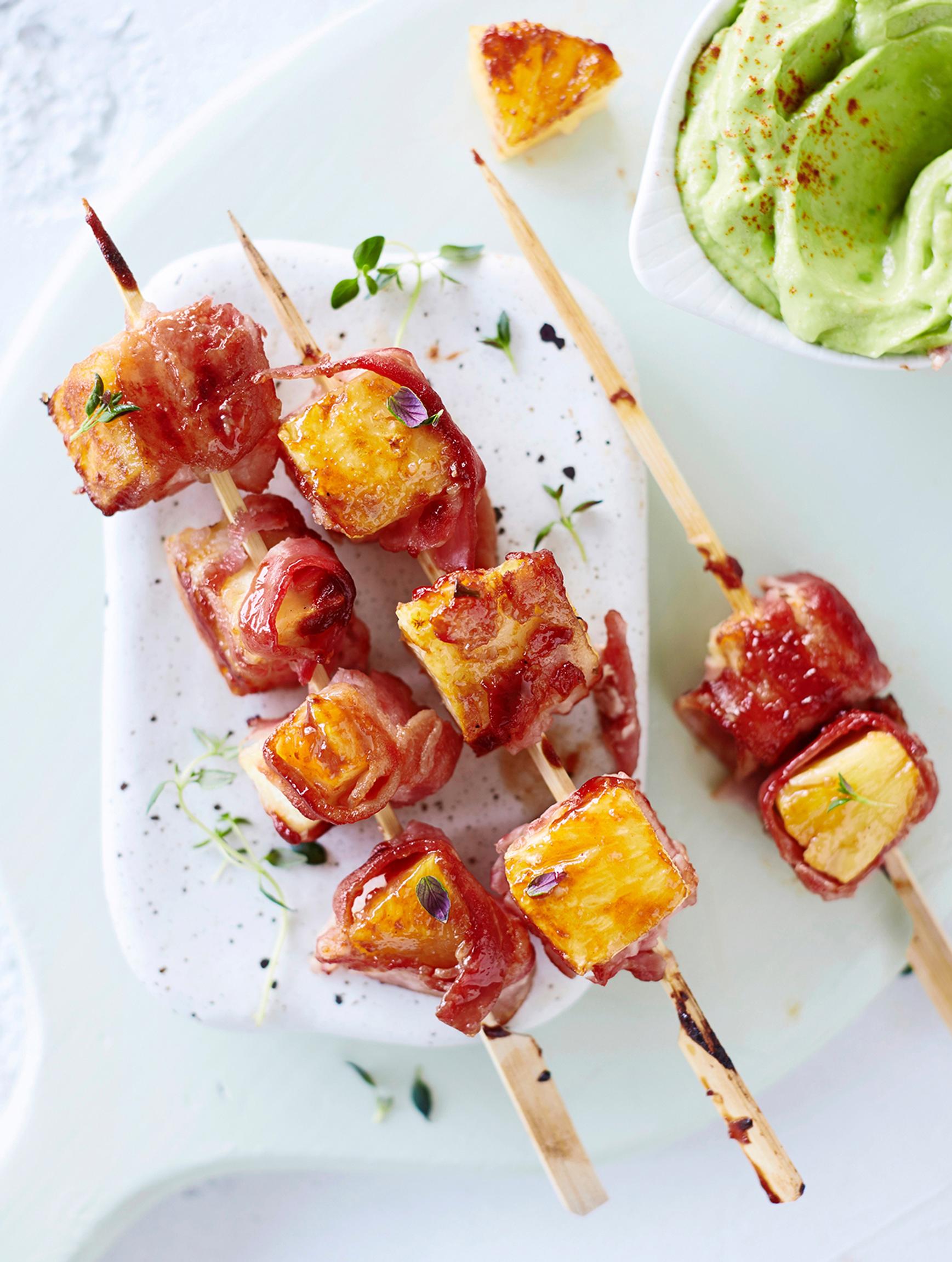 Tarjoile ananas-pekonivartaat avokadodipin kanssa.