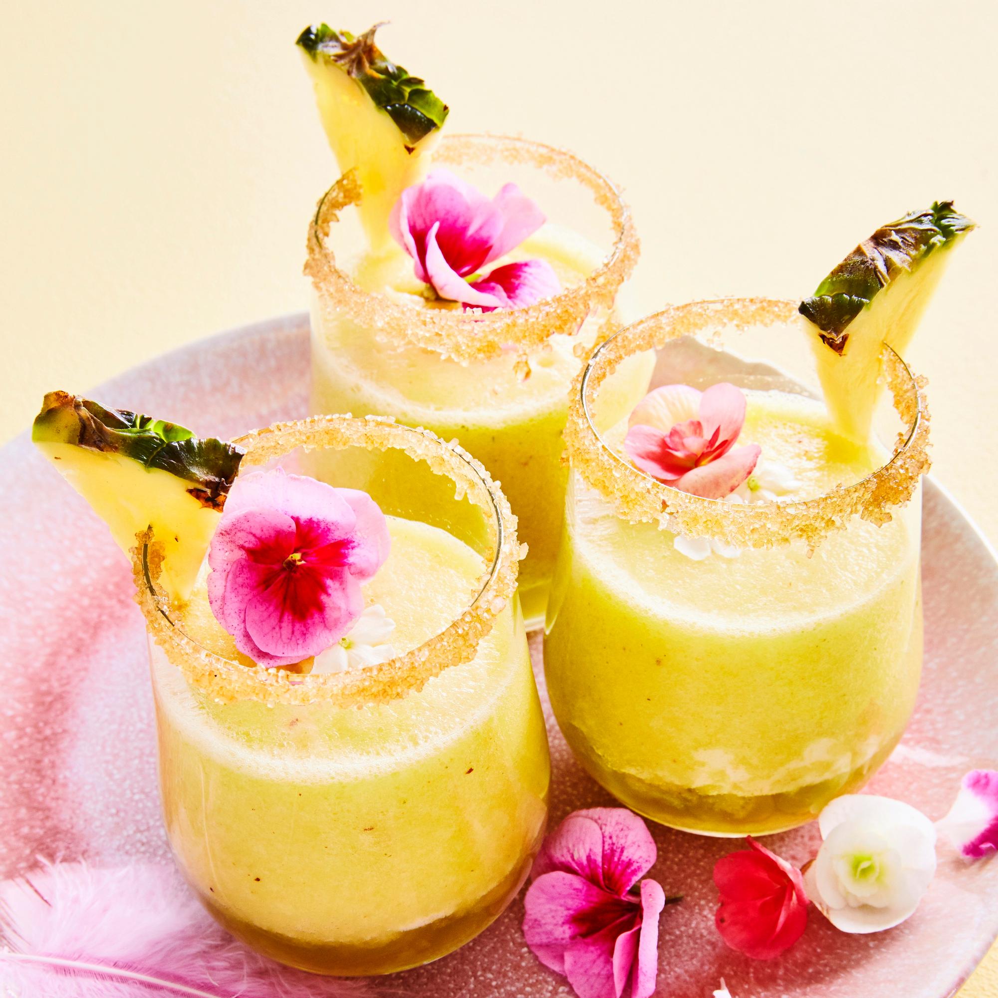 - Kostuta lasien reunat limelohkolla ja kasta sokeriin. Kaada ananas-rommifizz laseihin. Koristele pienillä ananasviipaleilla ja syötävillä kukilla.