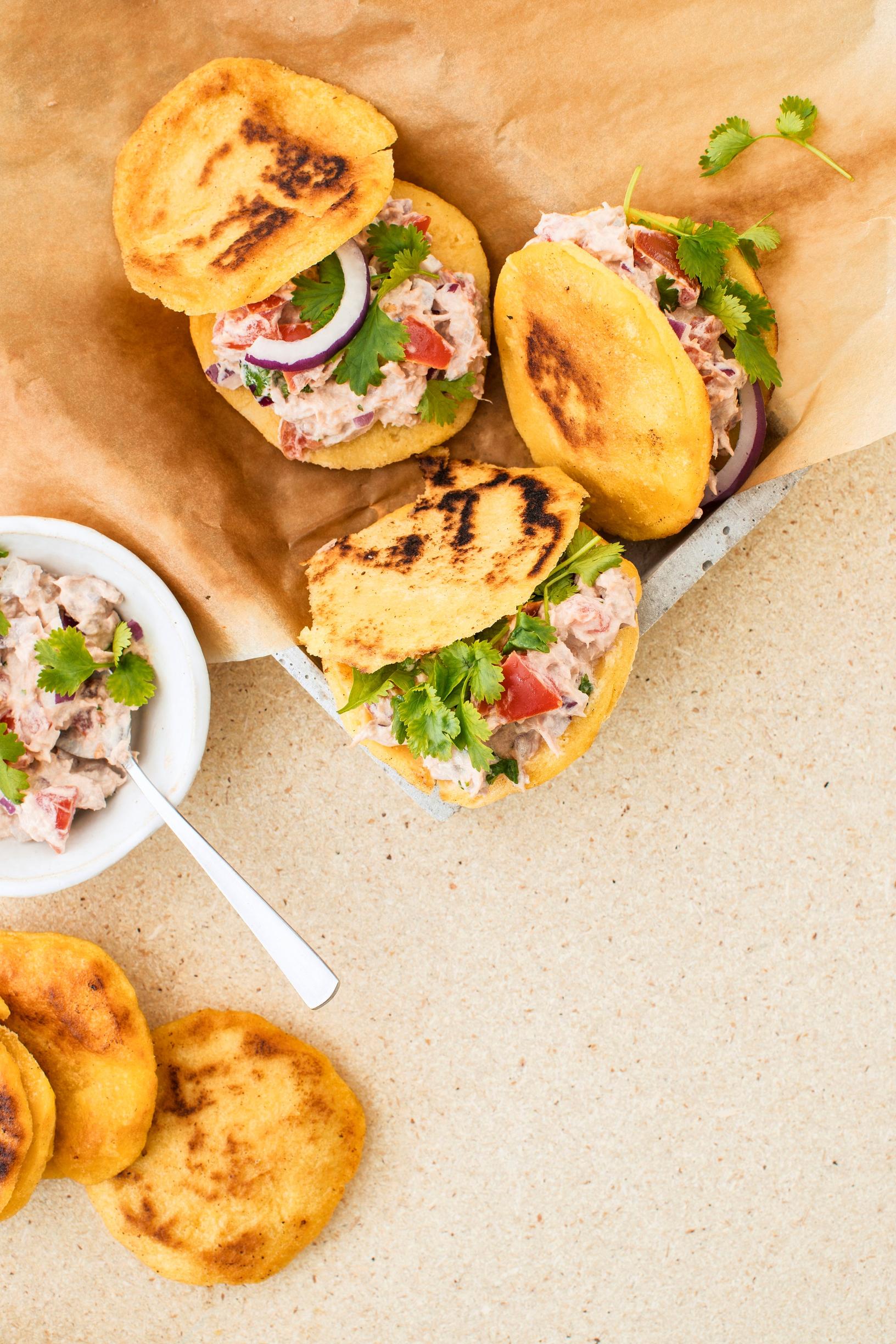Arepas-leivät muistuttavat hieman hampurilaista, mutta pihvin sijaan leipätaskut täytetään tonnikalalla ja kasviksilla. Gluteenitonta ruokavaliota noudattavien iloksi leipäset valmistetaan maissijauhoista.
