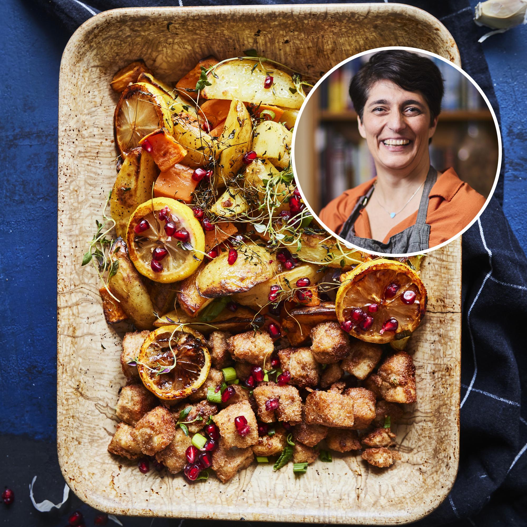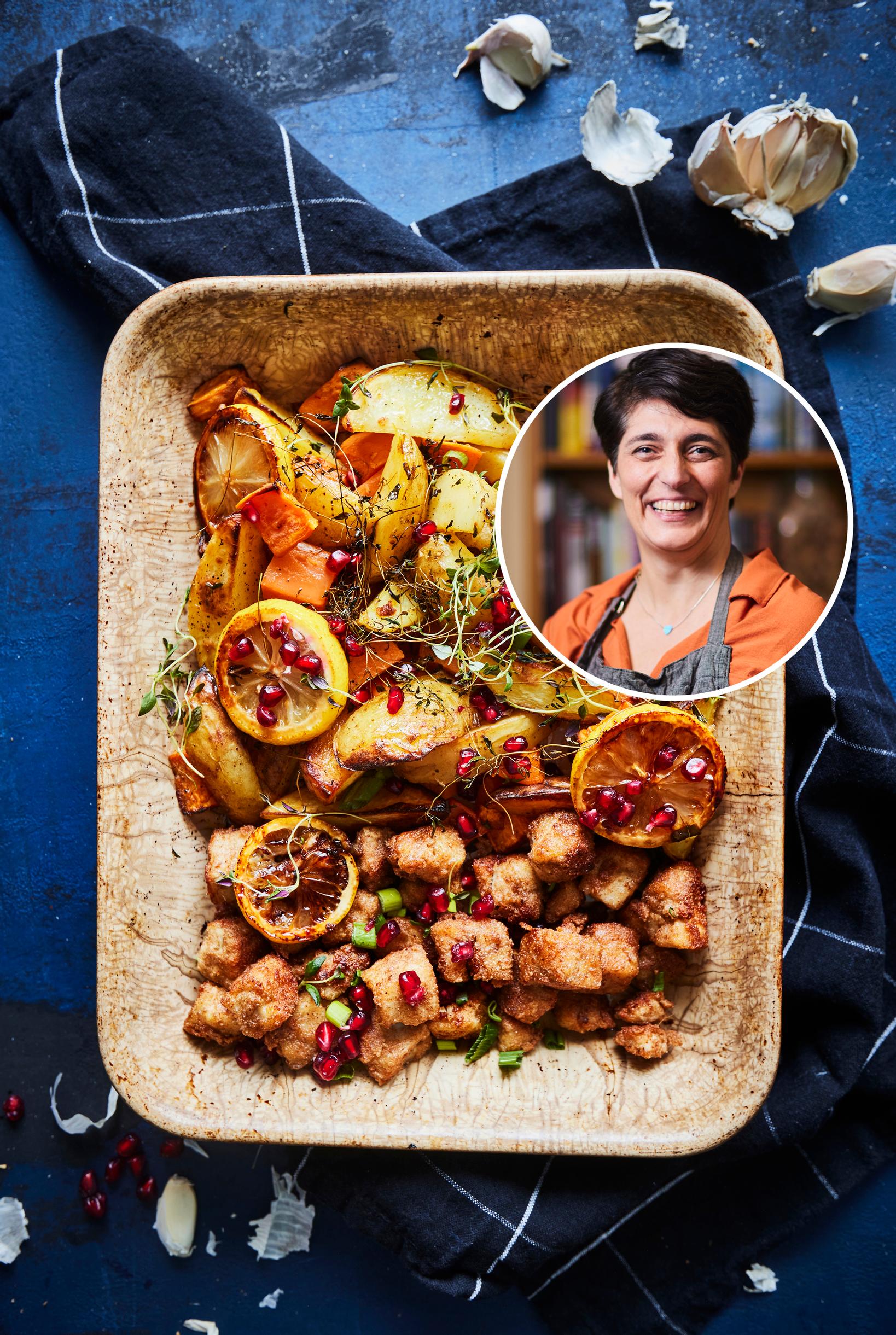 Tarjoa rapeat kalapalat maukkaan peruna-bataattipaistoksen kera. Viimeistele annos granaattiomenansiemenillä ja tuoreella timjamilla. "Olemme viettäneet monta kesää Espanjassa. Pakasteseiti jäljittelee andalusialaista valkoista kalaa ja vie makumatkalle etelän lämpöön”, Baba Foods -yrittäjä Ronit Hovav-Halonen kertoo.