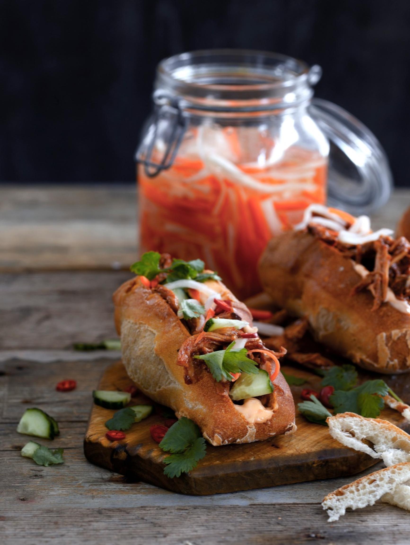 - Täytä leivät bbq-possulla, etikoituneilla porkkana-retikkasuikaleilla ja kurkkuviipaleilla. Viimeistele Bánh mí -leivät tuoreella korianterilla ja chiliviipaleilla.