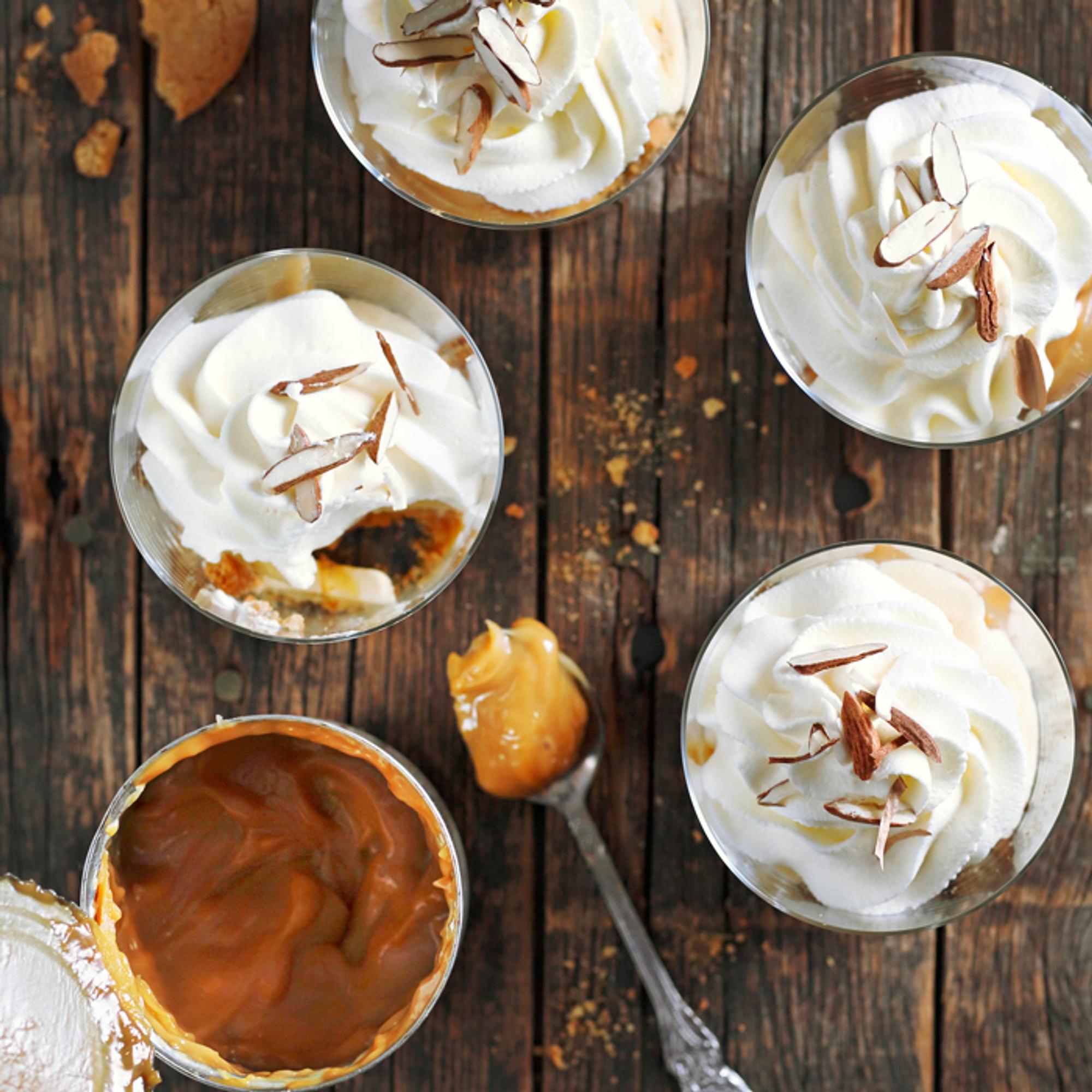 Kokoa jälkiruoat annosmaljoihin tai juomalaseihin. Murenna pohjalle keksiä, lusikoi päälle säilykepurkista toffeeta ja lado päälle banaaniviipaleita. Kuorruta lopuksi kermavaahdolla.