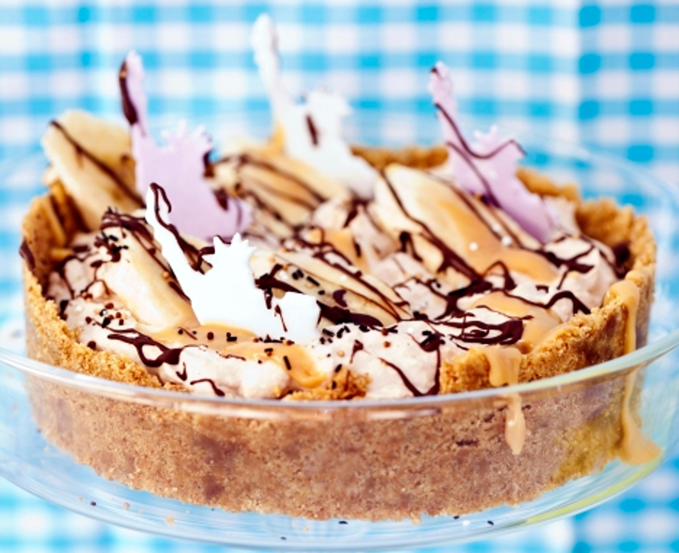 3. Kuori ja viipaloi banaani. Laita keksikerroksen päälle puolet banaaneista, kinuskia ja kermavaahto. Lisää kermavaahdon pinnalle loput banaaniviipaleet. Viimeistele pinta kinuskilla ja halutessasi sulatetulla suklaalla.