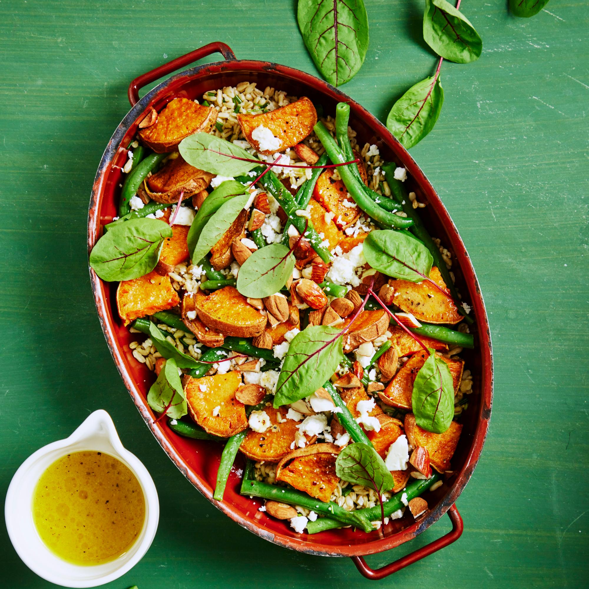 Nosta pöytään astetta parempi arkisalaatti. Täyttävä lounassalaatti syntyy kaurasta, pavuista, bataatista ja fetasta.