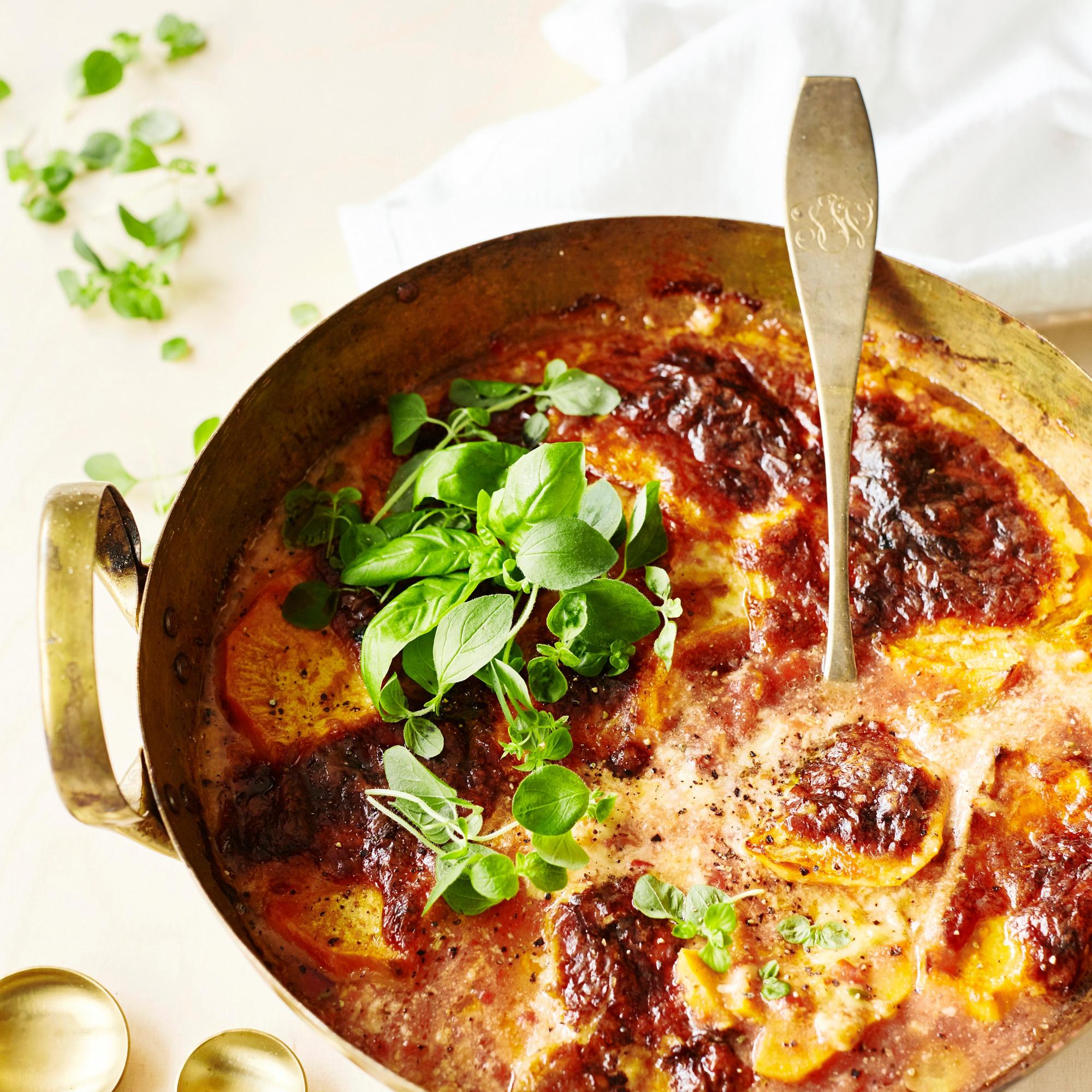 Bataattilasagne – sekoitusta vaille valmiista kastikkeista ja bataattiviipaleista rakentuu vuokaan mitä mainioin arjen uuniruoka