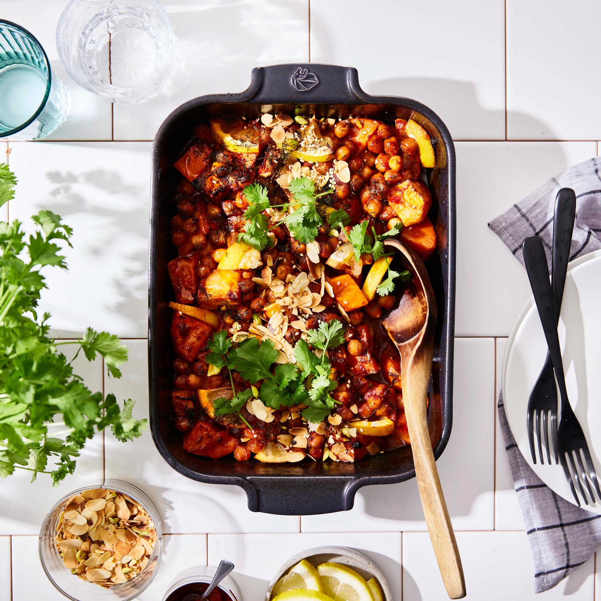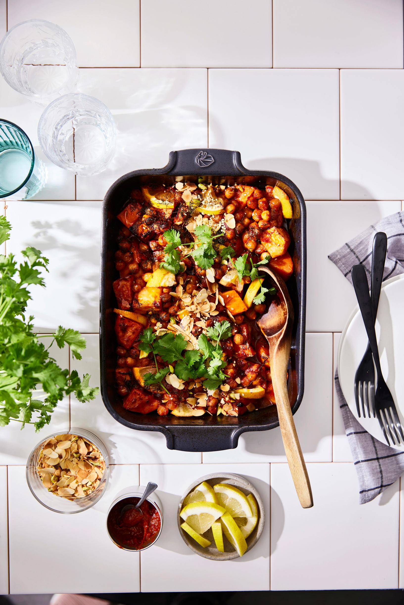Bataattivuoka maistuu pohjoisafrikkalaiseen tyyliin harissalta. Ruoka kypsyy laakeassa uunivuoassa hieman nopeammin kuin syvässä padassa.