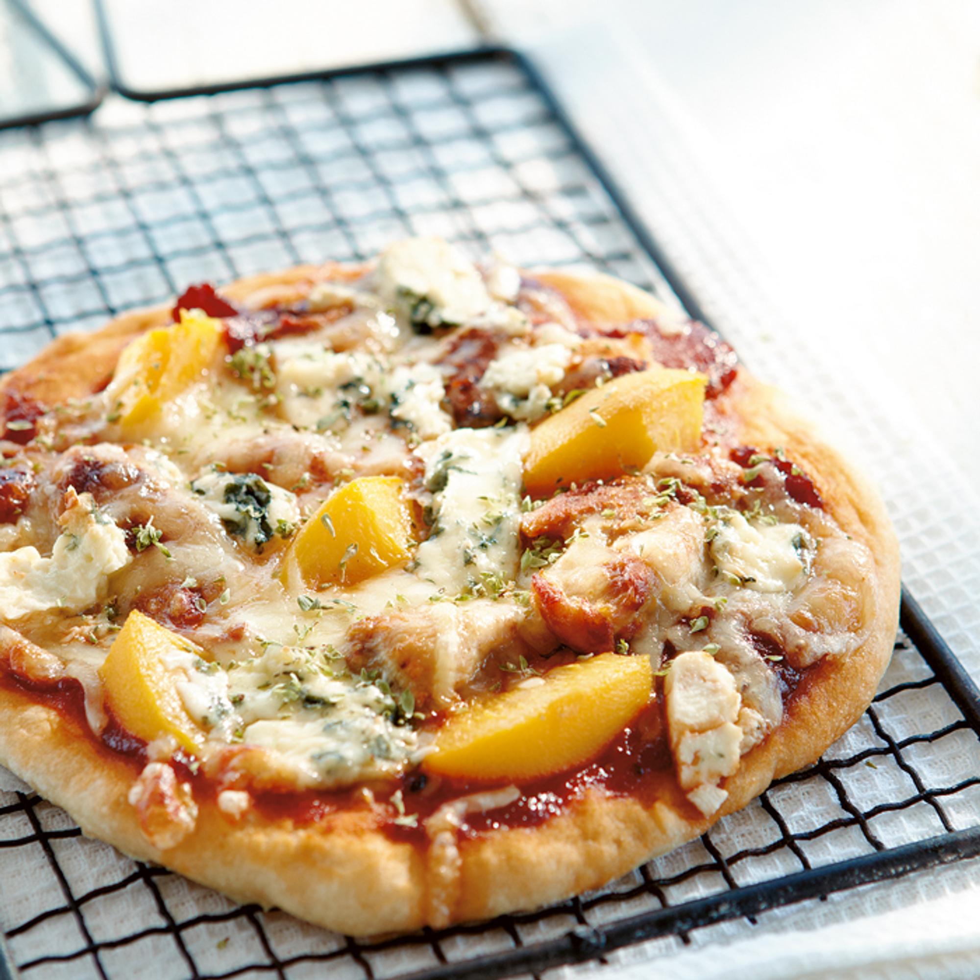 - Jaa broilerit, juusto ja persikat pizzan pinnalle.