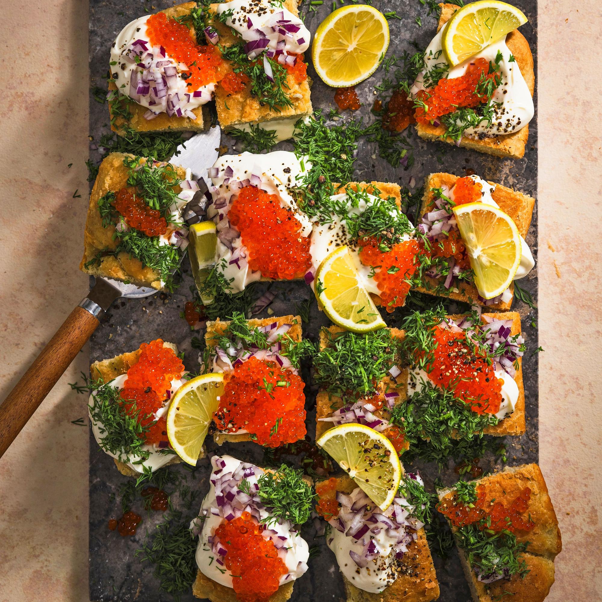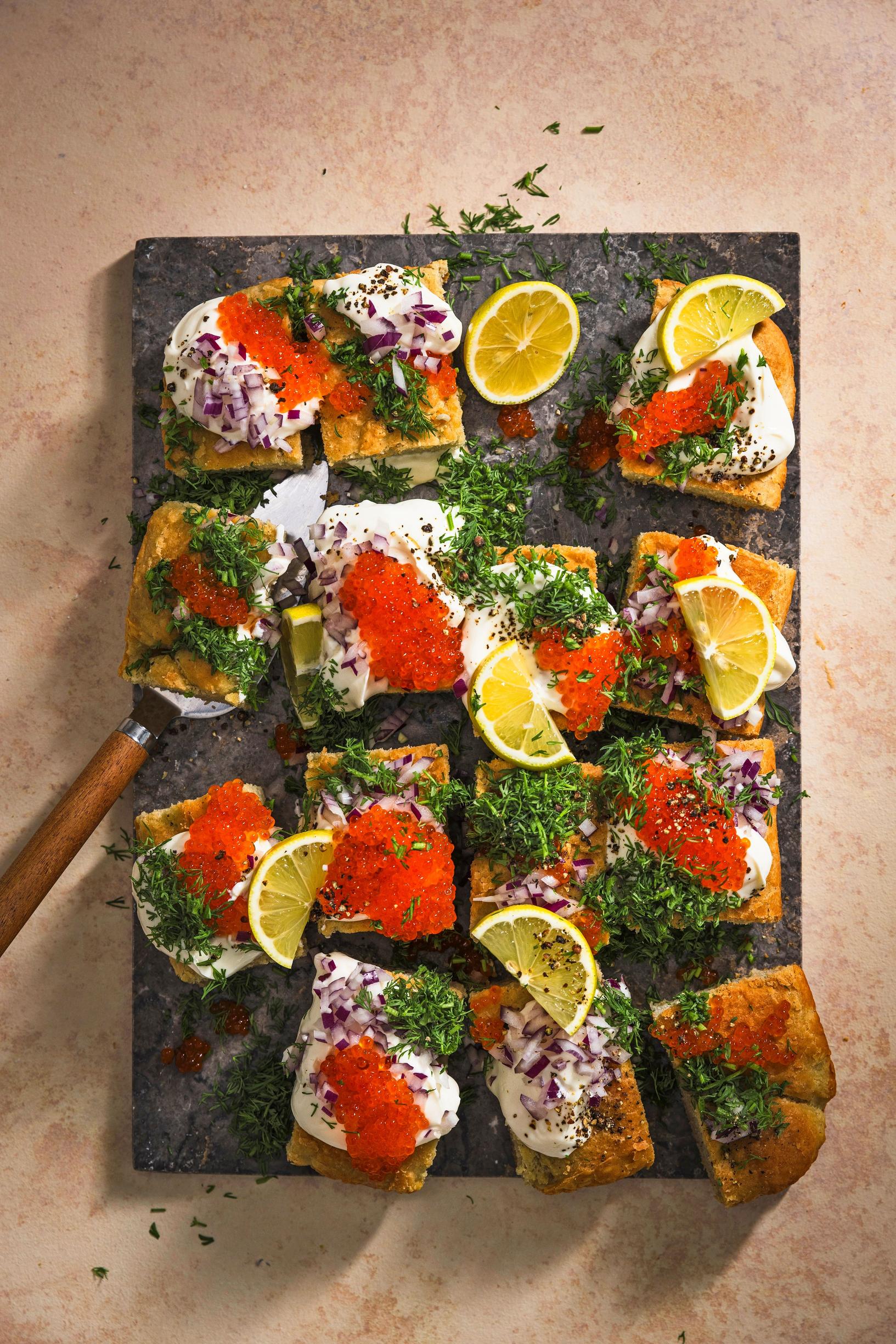 - Koristele haaleaksi jäähtynyt focaccia mädillä tai merileväkaviaarilla, ranskankermalla, punasipulilla ja tillillä. Viimeistele pippurilla ja sitruunalohkoilla.