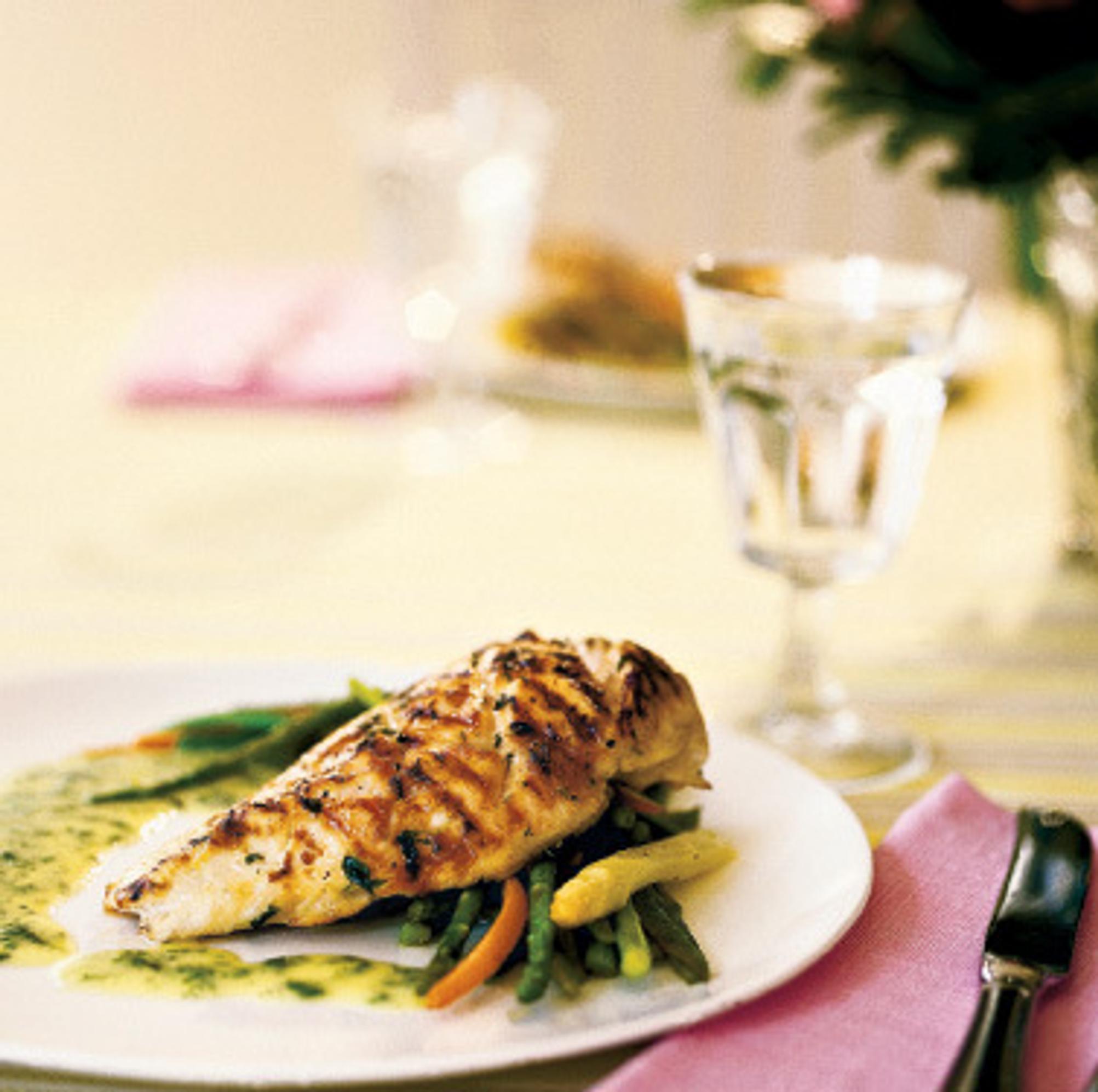 Tee terävällä veitsellä rintafileiden pintaan ristikkäisiä viiltoja, ei kuitenkaan fileiden läpi. Sekoita öljyyn hunaja, hienonnettu valkosipuli, timjami, merisuola ja mustapippuri. Sivele fileet mausteseoksella kauttaaltaan. Kuumenna parilapannu ja nosta puolet rintafileistä pannulle. Paista fileitä noin 5 minuuttia kummaltakin puolelta, kunnes ne ovat täysin kypsiä. Nosta fileet lautaselle ja peitä foliolla. Paista loput kaksi samalla tavalla. Voit myös ruskistaa fileet pannussa ja paistaa ne kypsiksi 200-asteisessa uunissa. Valmista kastike. Pane kattilaan vesi ja hienoksi hakatut persilja ja timjami. Kiehauta. Lisää voi ja anna kastikkeen kiehua hiljalleen koko ajan vatkaten. Mausta sitruunamehulla, suolalla ja pippurilla. Kokoa valmiit annokset. Asettele lautasen toiselle reunalle kevätvihanneksia, nosta filee kasviksille ja lorauta lautaselle yrtti-voikastiketta. Tarjoa heti.