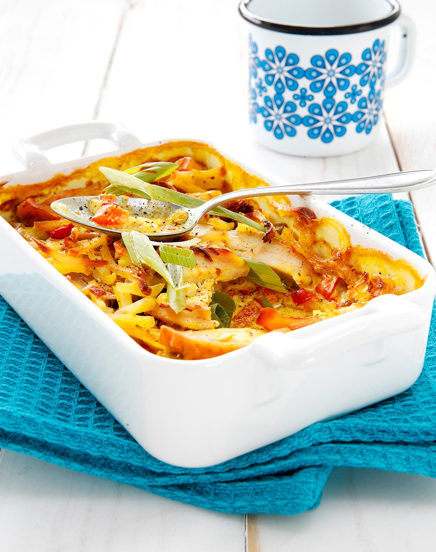 - Sekoita kermaan mausteet. Lisää voideltuun vuokaan peruna-sipulisekoitus, broileri, kevätsipuli ja paprika kerroksittain. Kaada päälle maustettu kerma.