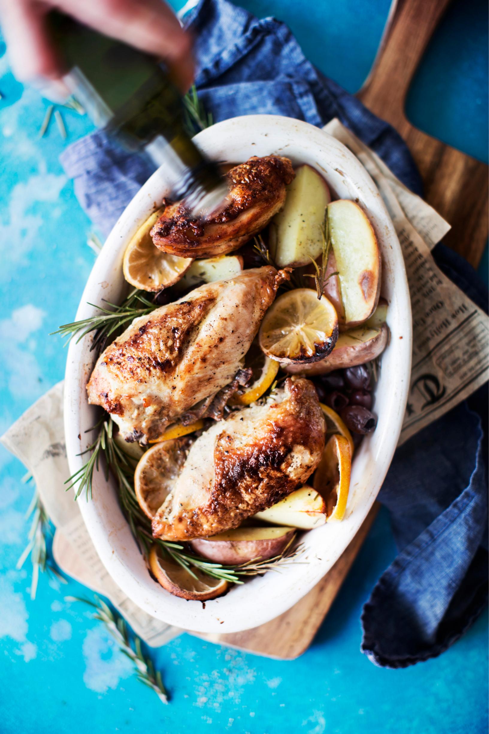 Lisää sitruunaviipaleet ja valutetut oliivit perunoiden ja broilerinleikkeiden lomaan. Mausta lopuksi tuoreella rosmariinilla.
