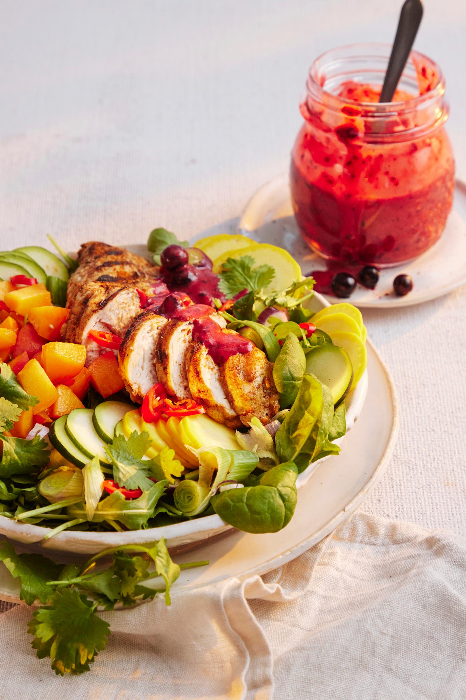 Broilerisalaatti ja mustaherukkakastike – tuttu makupari maistuu kesäisen salaatin muodossa