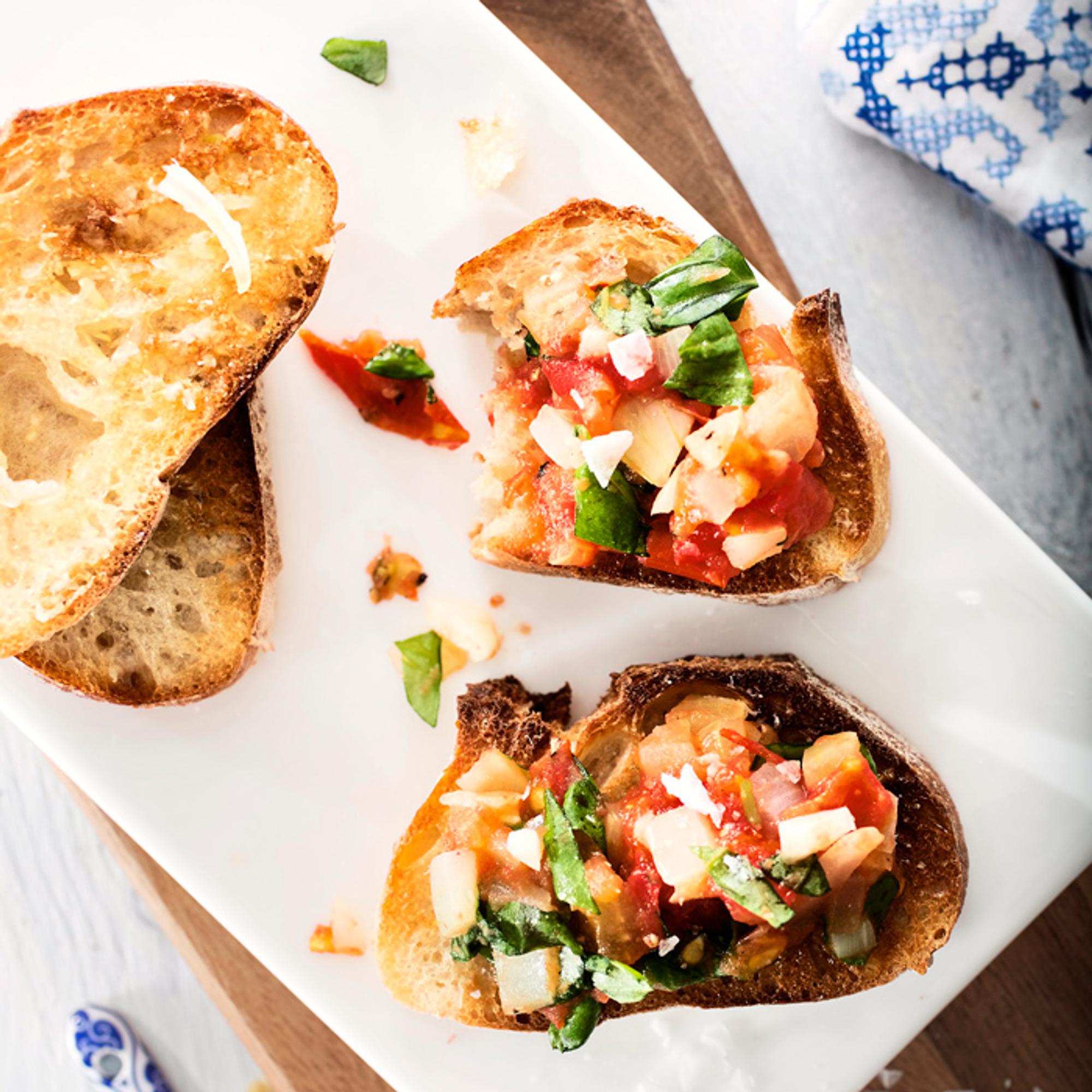 Lusikoi tomaattitäyte leipäviipaleille. Tarjoa bruschettat viivyttelemättä alkupalana.
