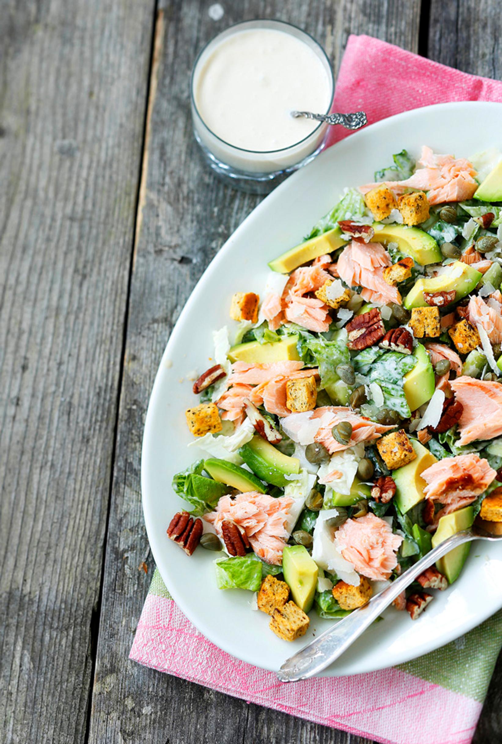 Caesarsalaatti saa herkullisen makunsa anjoviksella ja parmesaanilla maustetusta kastikkeesta. Tämän version kruunaavat avokado ja savulohi.