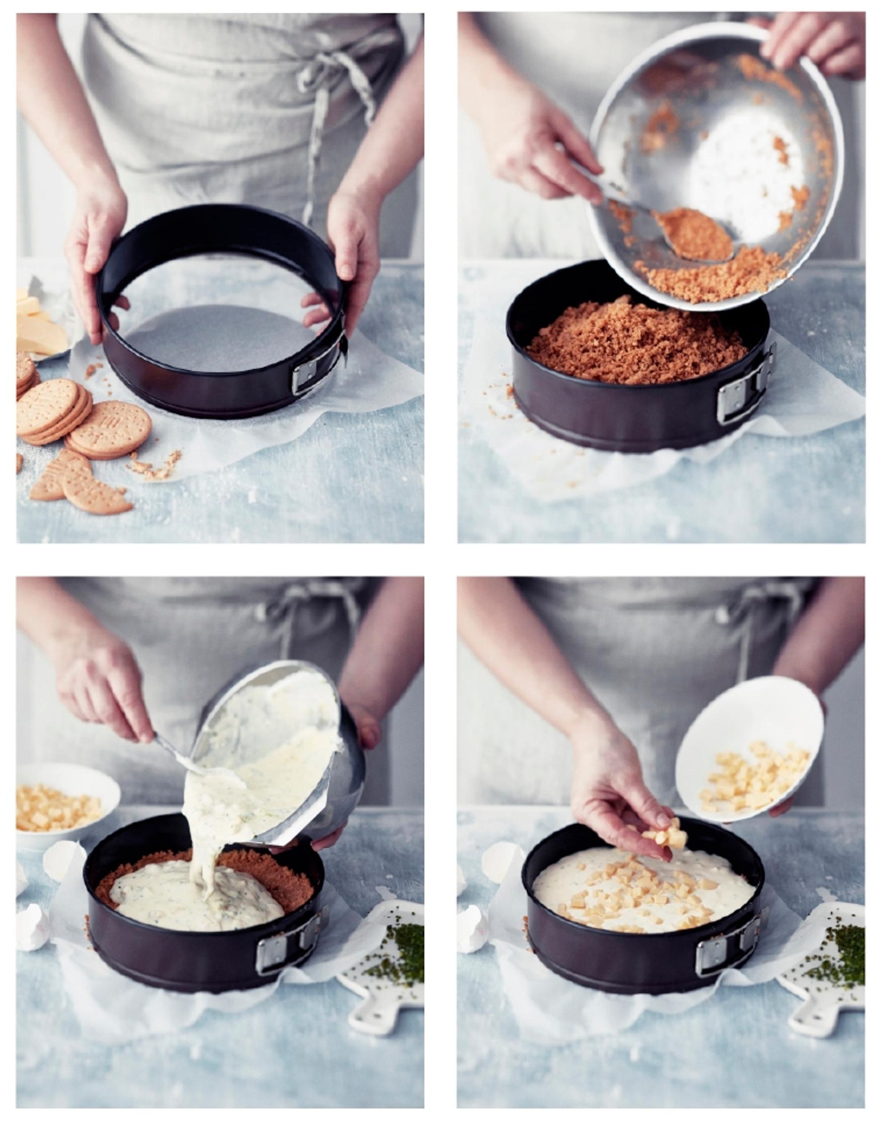 1. Pingota leivinpaperi halkaisijaltaan noin 20 sentin irtopohjavuokaan. Murskaa keksit. Sulata voi. Sekoita keksimurut ja voisula keskenään ja painele seos vuokaan. Laita pohja jääkaappiin puoleksi tunniksi.