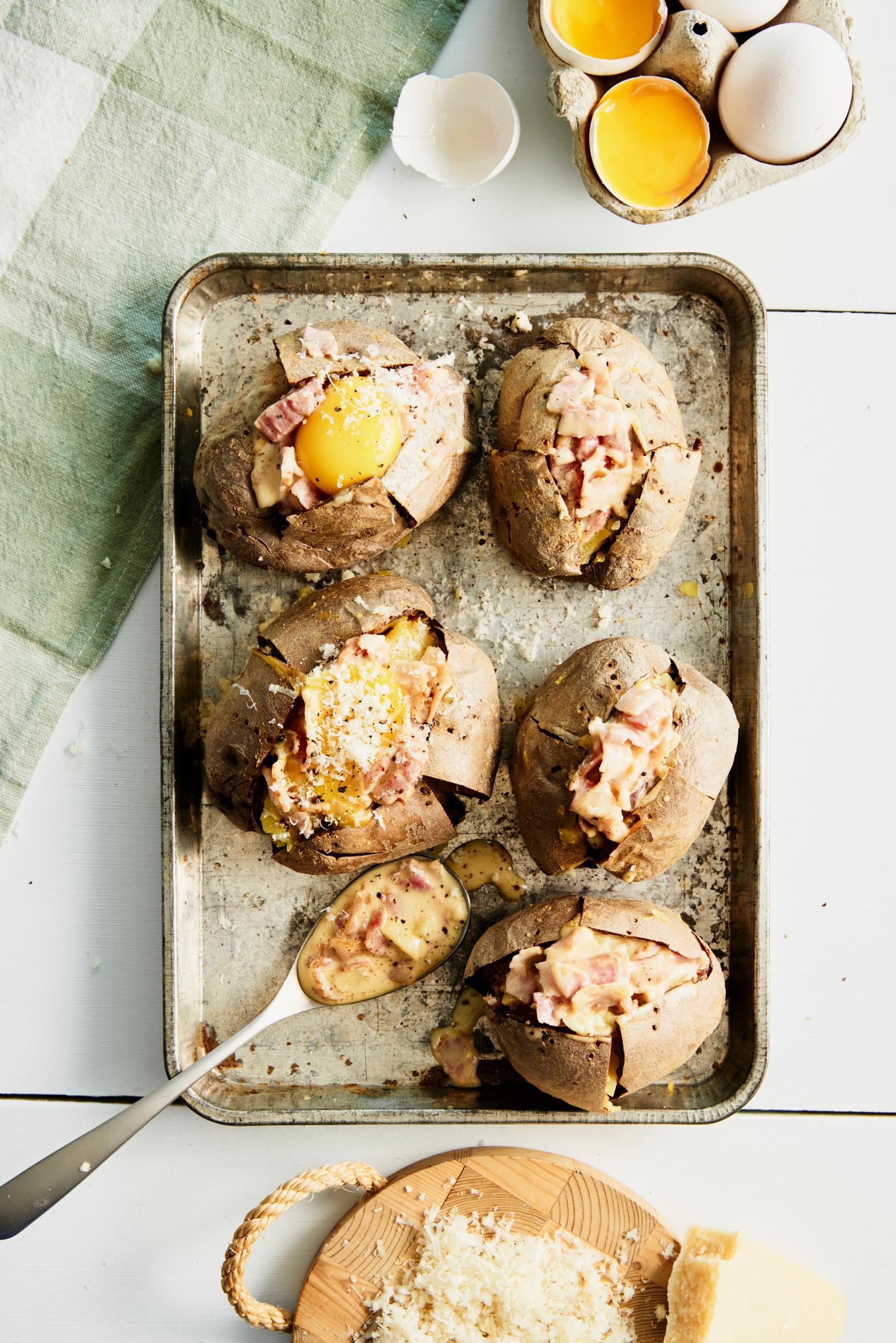 Carbonara-uuniperunat – tutulta pastalta lainattu kastike saa uuniperunan maistumaan entistä paremmalta